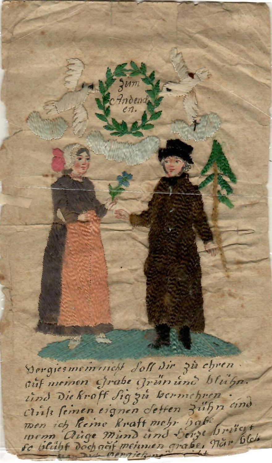 | Vyšívané přání s kresbou na papíře s německým textem. |