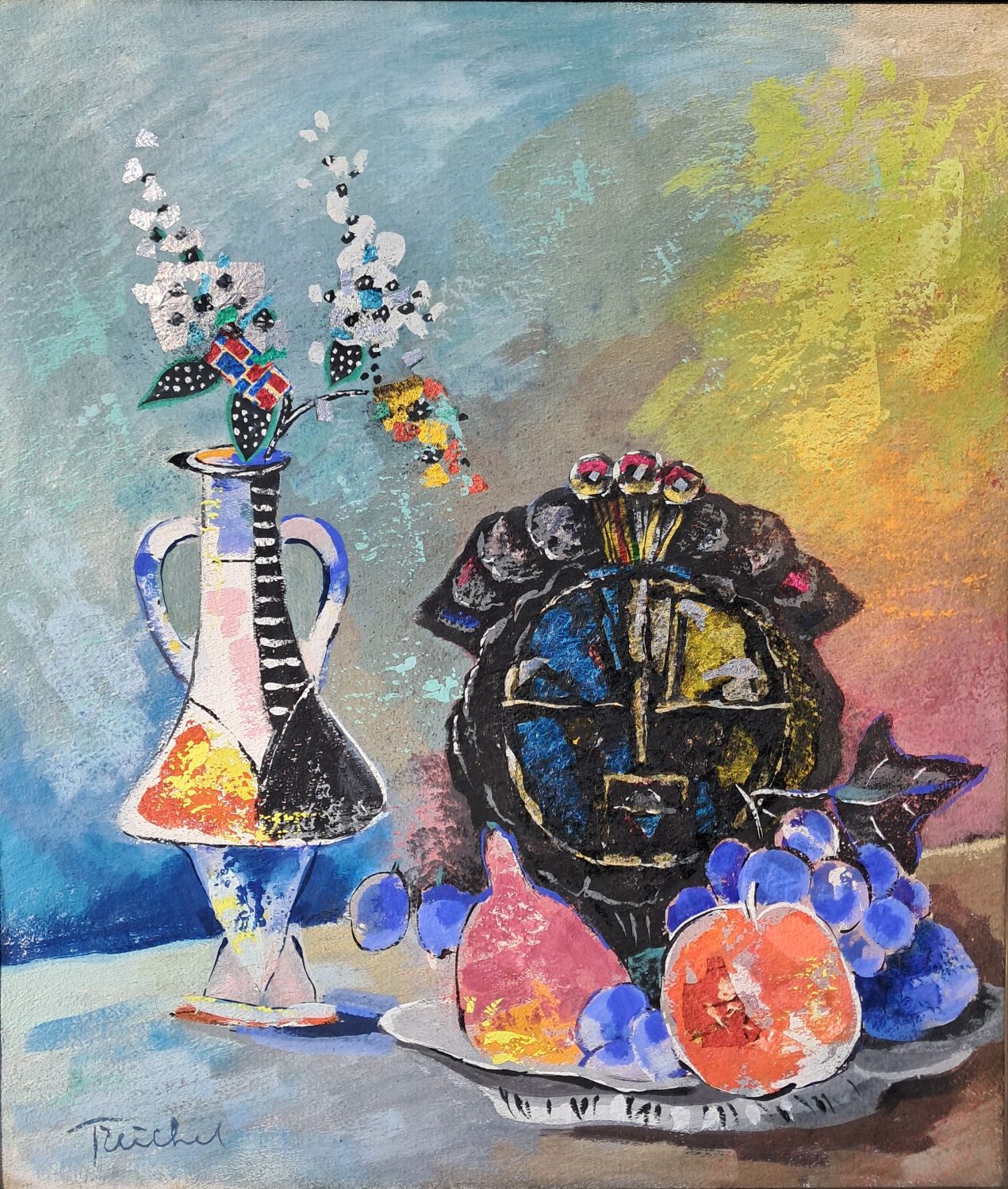 | Suchý olej a zafixovaný celofán na plátně, autorem podepsaný vlevo dole. Práce je opatřena jednoduchým tmavým rámem. |