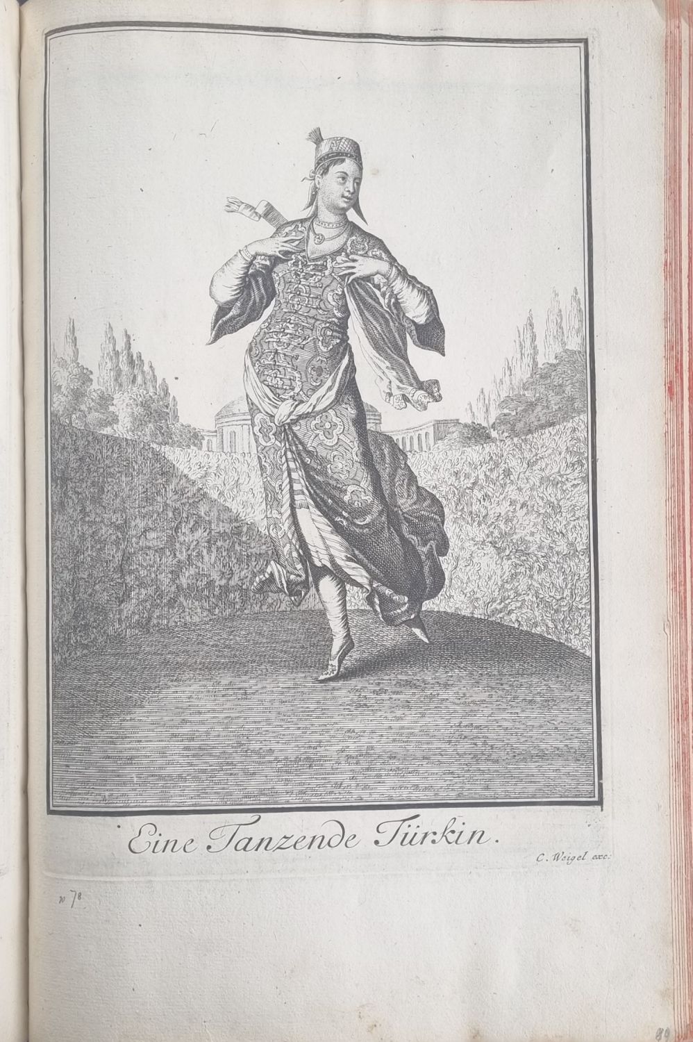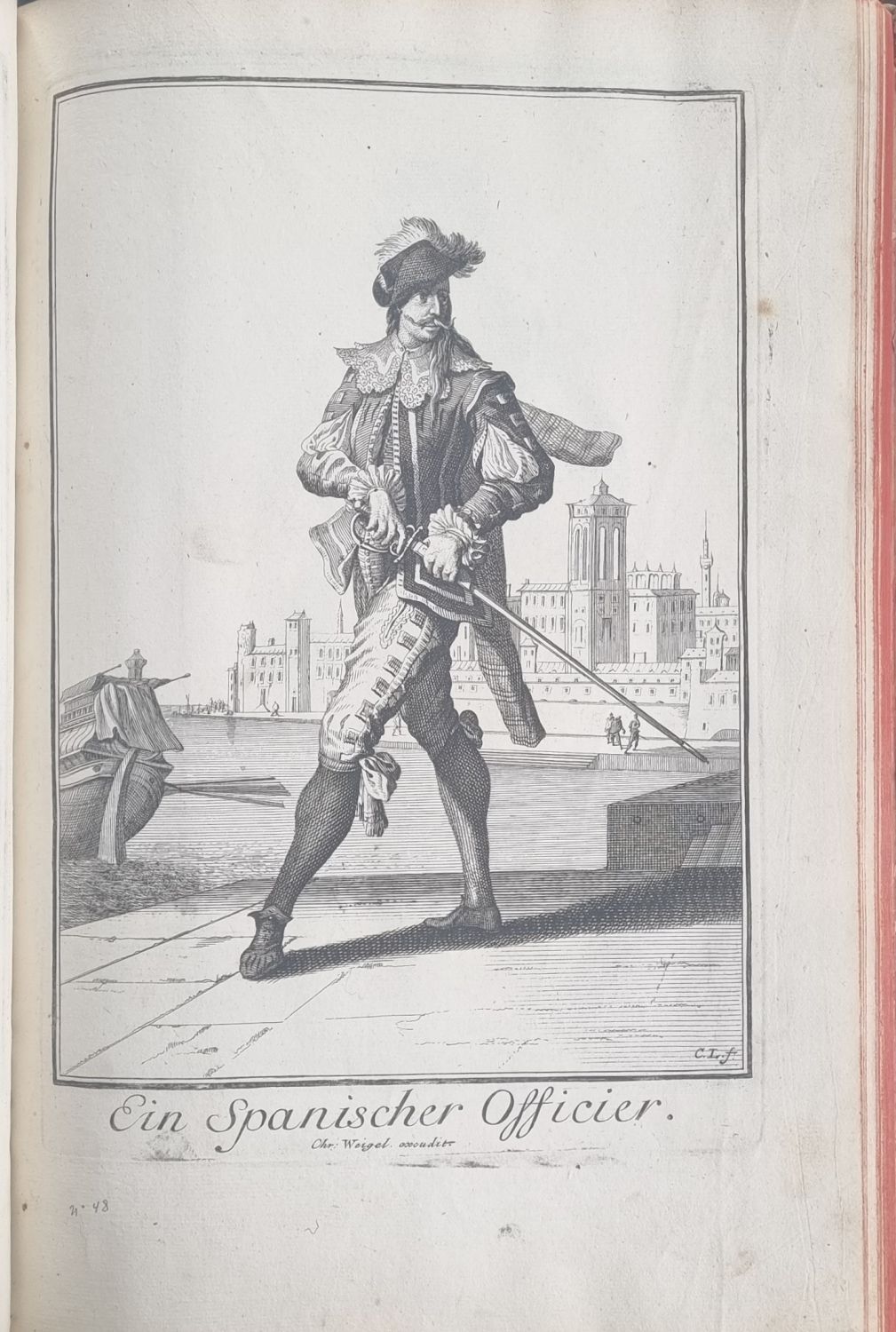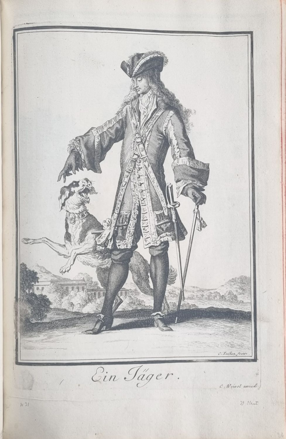 (Dünnhaupt I, str. 149-150; Lipperheide 32; Goedecke III,240,23.<br>Na foliu 2a tištěná dedikace císaři Josefovi I., na 2b datace Vídeň, 7.2. 1703. Krom ukázek kostýmů a šatů královské rodiny, vyššího duchovenstva a šlechty jsou v díle vyobrazeny oděvy měšťanů různých evropských měst, vojáků, sedláků, vybraných profesí, také Židů, Cikánů, Tatarů, polských hajduků (připomínajících spíše Turky), Turků, Peršanů, Etiopanů a Indiánů. - Typologicky variantní titulní list s uvedením roku vydání (jiné exempláře bez uvedené datace), exemplář obsahuje 107 mědirytin (všechny bibliografie uvádí pouze 100 rytin). - První vydání velmi vzácně se objevujícího díla.<br>Dobová kartonová vazba potažená škrobovým papírem, lehce ohmataná, ve hřbetu odřená, naražené rohy, poslední dva listy mírně zašpiněné, list 106 při spodním okraji v délce cca 5 cm podlepený.
