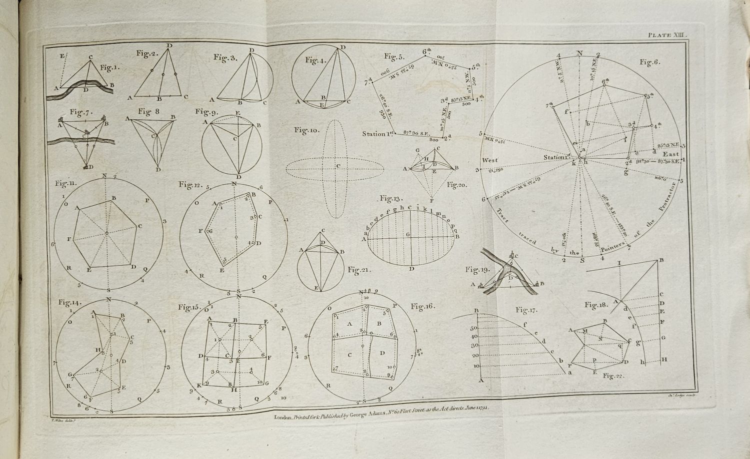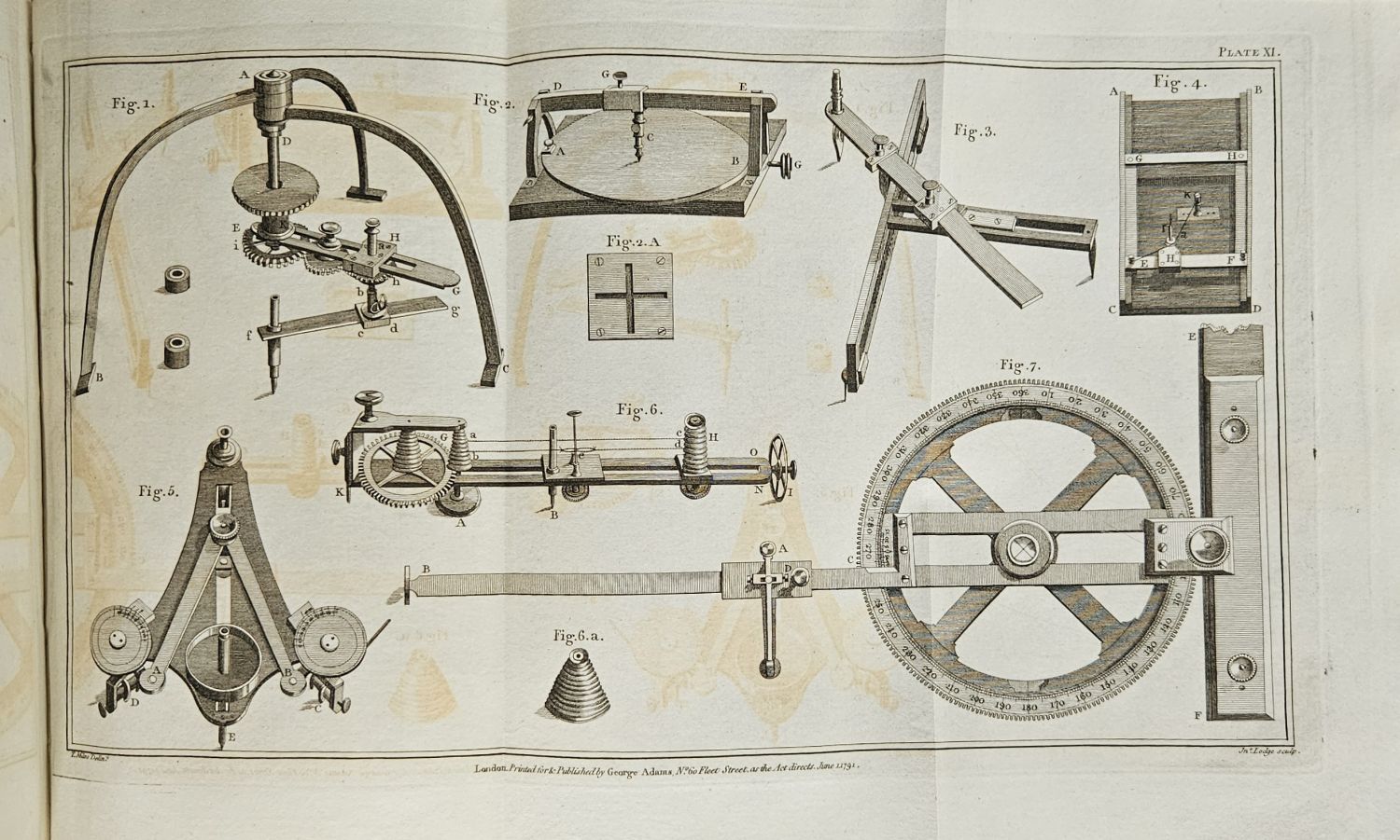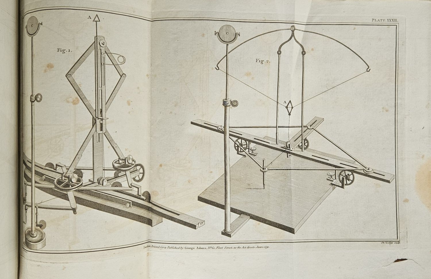 Dobová kartonová vazba potažená světle modrým škrobovým papírem, místy pap. pokryv odřený, ve hřbetu chybí zcela, naražené rohy, přední deska od šitého bloku rozvolněná, zadní uchycená pouze u prvního vazu, jinak uvolněná. Knižní blok neoříznutý.<br>George Adams, mladší (1750 - 1795) anglický vědec, optik, vědecký spisovatel a výrobce matematických přístrojů a glóbů.