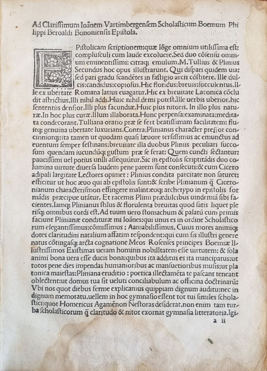 ISTC Ip00744000; BMC III, str. 40; Goff P744, HC 249, Šimáková-Vrchotka č. 1579<br>Tištěno bastardou, 39 řádků, tištěné poznámky po stranách, signatury, nepaginováno, od folia B6 neživá záhlaví, poslední folio nepotištěné. Imresum na rubu folia H7 "Finit Enee siluij seu Pape Pij. de Ritu. Situ Moribus. ac Conditione almanie opus celeber=rimum, ..... per Baccalariu(m) wolfgangum Stockel de Monaco. Opidanu[m] Lyptzick impressum. et bene emendatum. Anno a natiuitate cristi Millesimo quardringe[n]tesimonogesimeocto. Di vero nona Mensis aprilis (9.4. 1496)". - Dílo je druhým přívazkem níže posaných prací.<br>První dílo ve svazku - Plinius "Quae in isto continentur opusculo. C. Plinii iunioris epistolae per Philippum beroaldu[m] emendatae" & unus est adiunctus liber: qui in aliis sup i[m]pressis minime co[n]tinebatur. Etia[m] eiusdem auctoris panegaerycus in laudem Trayani imperatoris: & de iuris illustribus libellus". Venetiis, Albertus Vercellius, 20. Aprilis 1501, 102 nepaginovaných listů (a8-k8,l10,m8,n4 - na foliu b2 chybně uvedeno b3). Tištěno antikvou, impresum v kolofonu, tučně tištěné versálky ve výši 2-3 řádků, neživá záhlaví s vyznačením jednotlivých částí knihy, v úvodu jednotlivých knih (devíti) konturové iniciály v jednoduchém rámečku na ilustrativním pozadí zalomené do výše 6 řádků. Za devátou knihou na foliu i5 "C. PLINII SECVNDI NOVOCOMENSIS PANAEGIRICVS TRAIANO AVGUSTO DICTVS".<br> + 1. přívazek: Beda svatý; Publius, Victor "Venerabilis Bedae presbyteribus siue de sex aetatibus huius seculi Liber Incipit. P. Victoris De Regionibus Urbis Rome Libellus Aureus. Cum priuilegio". Venetia, Ioan. de Tridino alias Tacuino, 28. Mai 1505, 50 listů (A4-L4,M6), tištěno antikvou, tištěné rubriky a poznámky po stranách, tři konturové iniciály v jednoduchém rámečku na pozadí z rostlinných ornamentů zalomené do výše 4 řádků, konturová iniciála v jednoduchém rámečku s vyobrazením dvou nahých chlapců a psa zalomená do výše 9 řádků. Impresum v kolofonu, v úvodu předmluva Petruse Mar.(enuse) Aleandera datovaná v Patávii (Padově) I.4. 1505.<br>Pozdně renesanční vazba, dřevěné desky potažené tmavě hnědou hovězinou, na obou deskách tlačený dvojitý rám zdobený rostlinným ornamentem, uvnitř rámu menší rám ze čtyř linek vyplněný rostlinným ornamentem. Vazba místy odřená, při okrajích restaurovaná, rostlinný ornament zčásti setřený, při horním okraji přední desky u hřbetu v délce 4,5 cm naprasklá, na zadní desce na několika místech proděravělá od červotoče a při vnějším okraji chybí kousek koženého pokryvu. Na předním přídeští nalepeno ex libris s rakouskou orlicí. Na přední předsádce vlastnický přípis "Luigi di Campi" a perem napsaný obsah svazku. Na tit. listu prvního díla jiný vlastnický přípis perem "Sum ex Bibliotheca Mathiae ?". Místy zahnědlý papír a světle hnědé skvrny způsobené vlhkostí. U druhého přívazku (Pia II.) mezi folii G6 a H1 vevázána makulatura z gotického rukopisu.