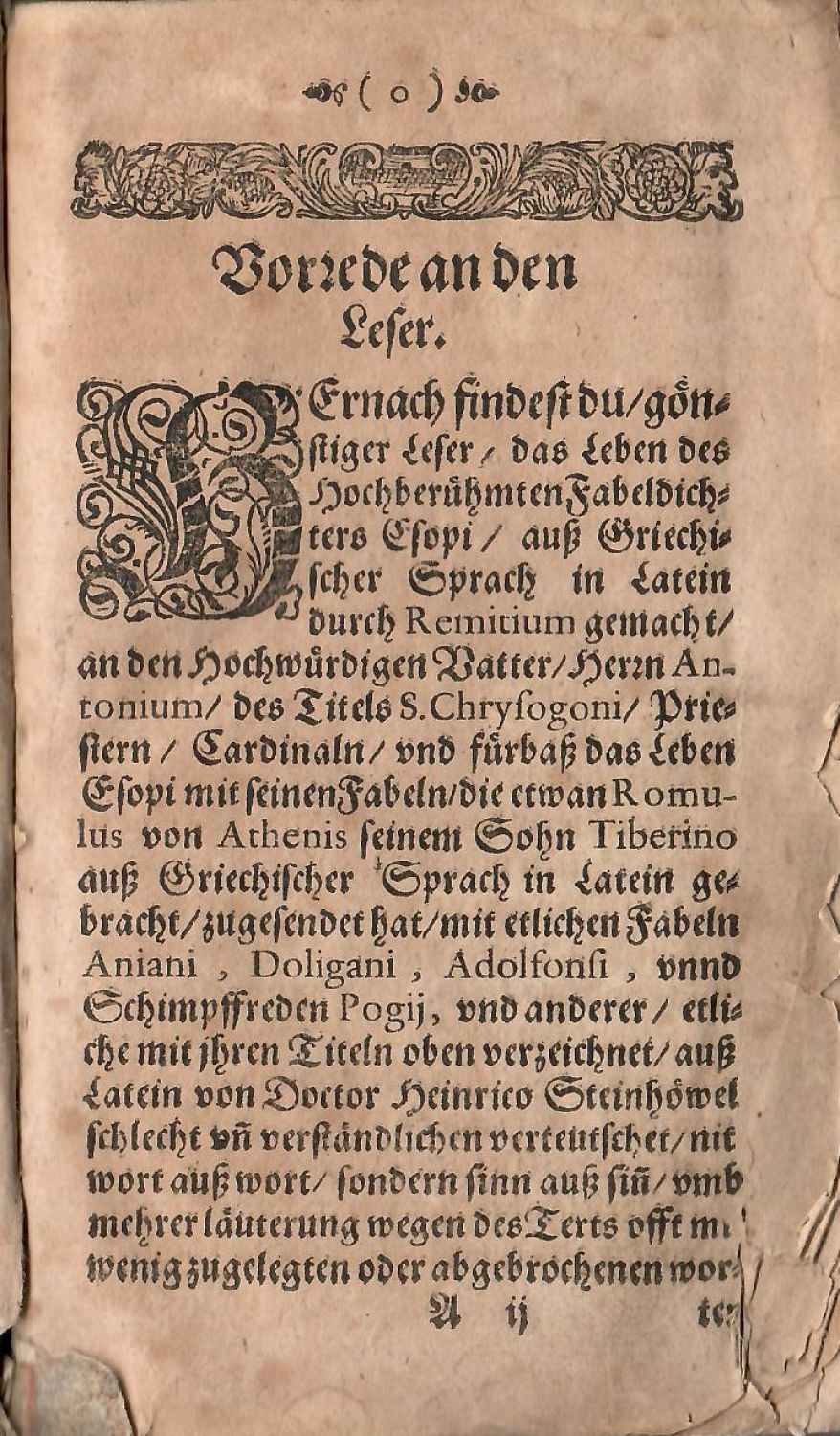 Der gantze Lehr=vn[nd] Sin[n]reiche Fabeldichter Esopus: Das ist/ Das gantze Leben vnnd Fabeln Esopi: Sam[m]t einem Anhang der Fabeln Aniani/ Adelfonsi/ vn[nd] etlicher Schimpff=Reden Pogij: Auch Außzügen schöner Fabeln vnd Exempeln D. Sebastian Brands. Alles mit schönen Figuren zu besserer Einbildung in Druck gegeben/.
