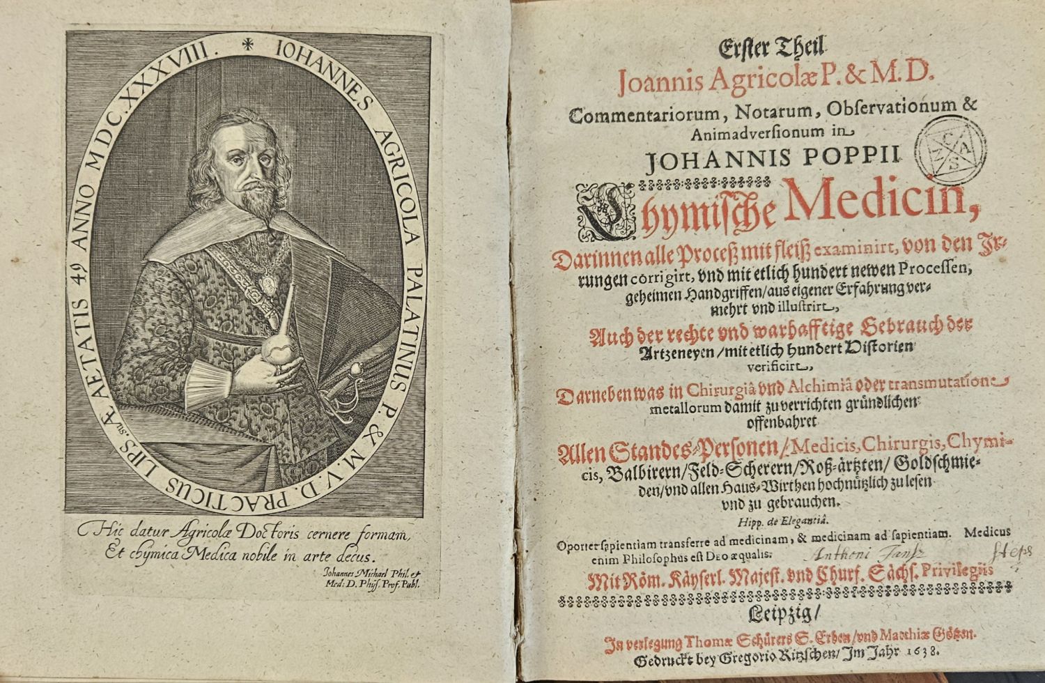 IOANNIS AGRICOLAE Palatini P. et M. D COMMENTARIA ET observationes. In die Chymische Artzeney Johannis Poppii In welchem viel gewaltige geheime handgriffe auch etlich hundert gantz newe Process bei, des in Medicina und Chirurgia so wohl auch Alchymia oder transmutatione metallorum gefunden werden. Allen Standes Personen hochnutzlich zulessen. Erster Theil .... Darinnen alle Process mit fleiss eaminirt, von den Irrungen corrigirt, und mit etlich hundert newen Processen, geheimen Handgriffen/ aus eigener Erfahrung vermehrt und illustrirt. Auch der rechte und warhafftige Gebrauch der Artzeneyen/ mit etlich hundert Historien verificirt. Darneben was in Chirurgia und Alchimia oder transmutation et matallorum damit zu verrichten gründlichen offenbahret Allen Standes=Personen/ Medicis, Chirurgis, Chymicis, Balbirern/ Feld=Scherern/ Ross=ärtzen/ Goldschmieden/ und allen Haus=Wirthen hochnützlich zu lesen und zu gebrauchen.