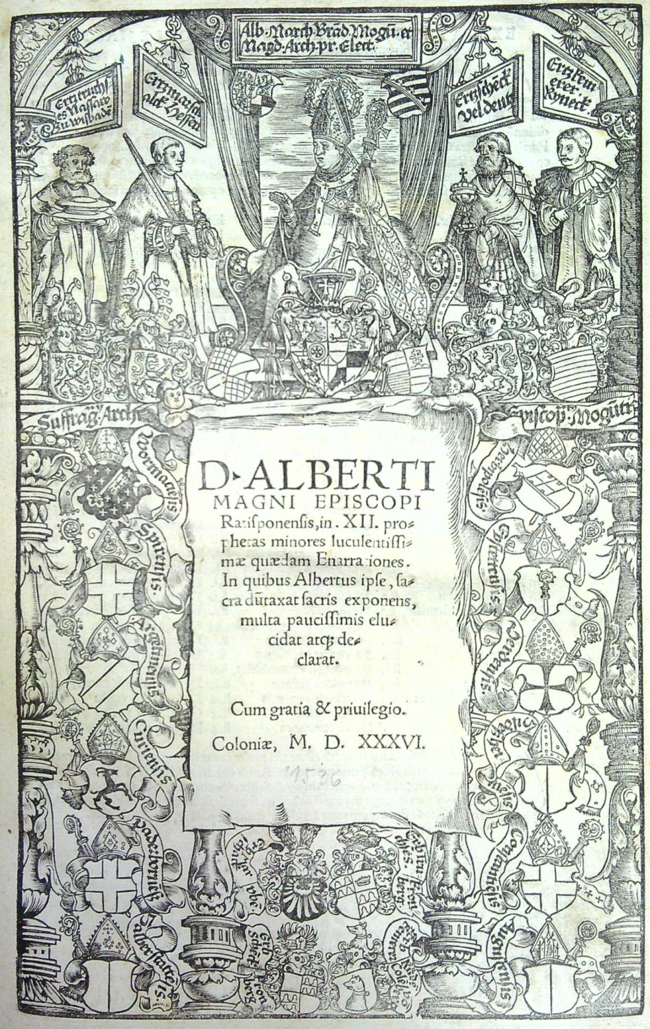 | Ilustrace: | Titulní list v dřevořezové borduře od Antona Woensama, v horní části bordury portrét Alberta Velikého s biskupskou mitrou na hlavě a berlou v ruce, kterému vzdávají hold světská knížata, na líci dedikačního listu konturová iniciála v jednoduchém rámečku ve výši 13 řádků se zakomponovaným portrétem Alberta. V textu řada Woensamových dřevořezových konturových iniciál ve výši 6-10 řádků na ilustrativním pozadí. |