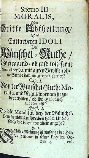 Das Entlarvete Idolum der Münschel=Ruthe/ Oder Gründliche Untersuchung, was bisshero HISTORICE mit derselben passiret/ ob sie PHYSICE in der Natur gegründet/ und wie fern MORALITER darnach zu operiren seyn? Aus Liebe zur Warheit und der fürmitzigen Welt zur Warnung Mit Approbation so wohl der Theolog. als Philosophischen Facultäten in Leipzig/ an Tag geleget durch Theophilum Albinum, C. ad M. S.n