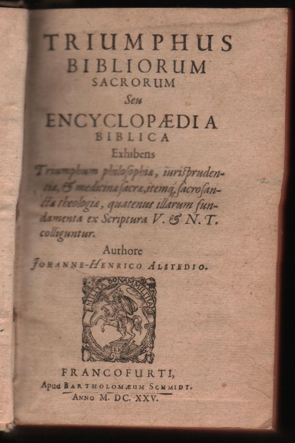 Na tit. listu dřevořezová viněta, signatury, stránkové kustody, plné iniciály zalomené do výše dvou řádků, vstupní iniciála na rostlinném pozadí ve výši 4 řádků, na straně 153-154 notace s hebrejsky tištěným textem písně.<br>Dobová pergamenová vazba s tlačeným a zlaceným zrcadlem zdobeným ornamentem, ve vnitřních rozích zrcadla a uprostřed něj tlačené žaludy, ve hřbetu jednotlivá pole od sebe oddělená dvojitou jednoduchou linkou, v každém poli tlačené žaludy, červeně barvené ořízky. Na rubu tit. listu stará provenienční razítka (Doublette der Stadt Bibliothek Breslau a Ex Bibl. ad aed. Mar. Magdal - stejné razítko na konci textu). Později byl vlastníkem knihy významný protestantský historik F. M. Bartoš z jehož knihovny kniha pochází.<br>Johann Heinrich Alsted (1588-1638) jeden z nejdůležitějších encyklopedistů všech dob, Komenského učitel v hessenském Herbornu, autor řady pansofických prací s cílem reformovat vzdělávání a výchovné metody. Jako jeden z prvých se zabýval otázkami mnemotechniky a umění kombinace. Jako teolog kalvinista, který ve svých pracích polemizoval s autory jiných náboženských vyznání. V námi nabízeném díle nezapřel svoji encyklopedickou erudici a ve stejném duchu sepsal tuto biblickou encyklopedii.