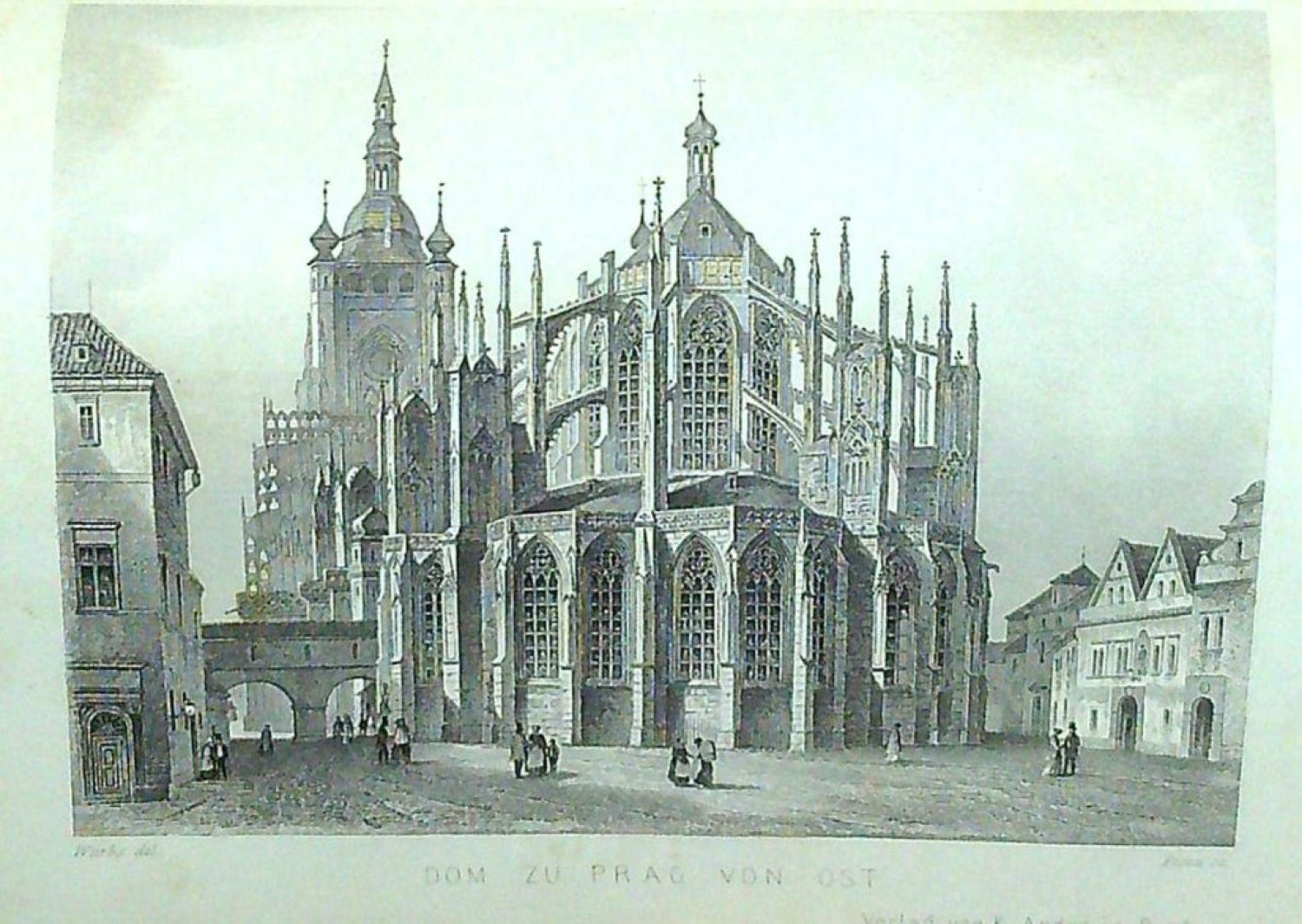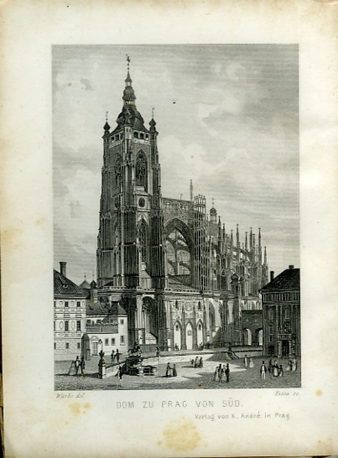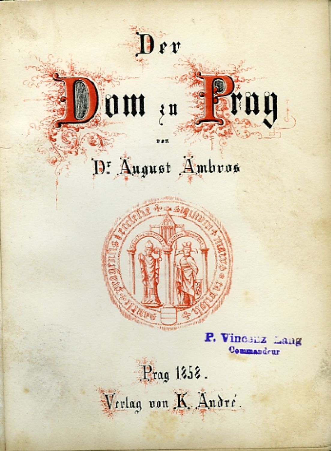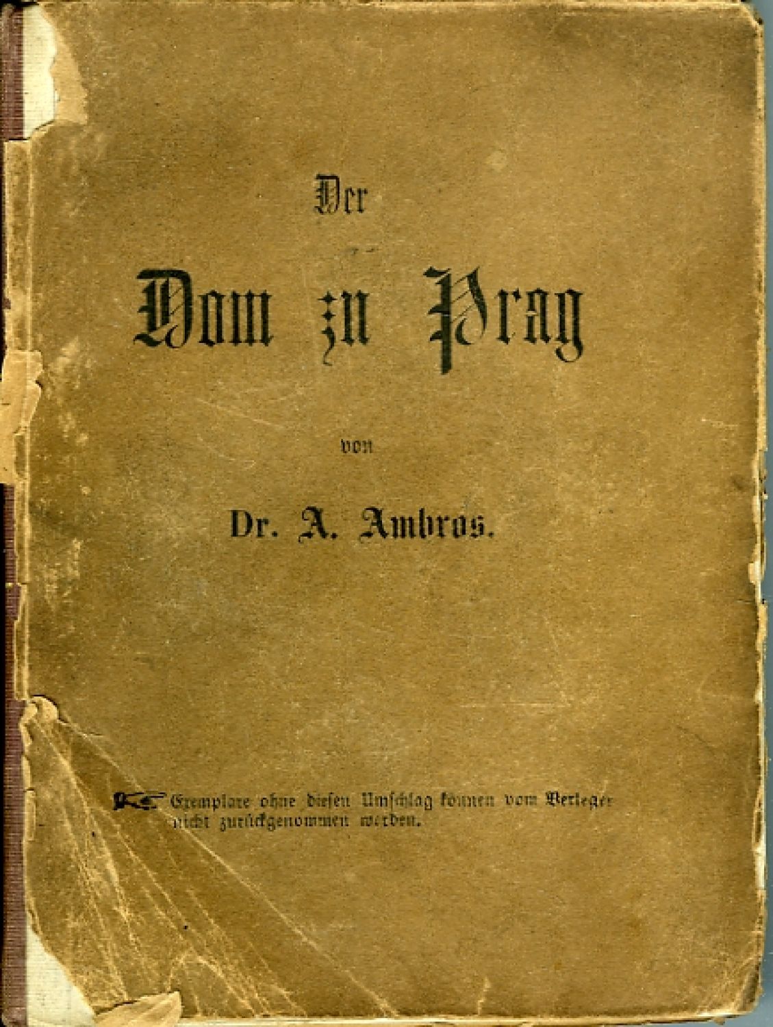 Hnědý plátěný hřbet se zlac. věcným názvem, na obou deskách litograf. ilustrace, torso pův. přebalu (pokryv hřbetu chybí); na okrajích listů místy hnědé skvrnky, na tit. listu staré vlastnické razítko "Vincenz Lang Commandeur". - Podrobný popis svatovítské katedrály z pera hudebního skladatele Viléma Augusta Ambrose (1816 Mýto - 1876 Vídeň). Od r. 1869 byl profesorem hudby na pražské univerzitě a profesorem dějin na konzervatoři (díky jeho nepříznivému zdání se nestal B. Smetana ředitelem pražské konzervatoře) a počínaje r. 1872 působil ve Vídni, kde přispíval jako kritik do různých hudebních časopisů, mimo jiné i do Schumannovy "Neue Zeischrift für Musik". Jeho nejvýznamnějším dílem jsou nedokončené "Geschichte der Musik".