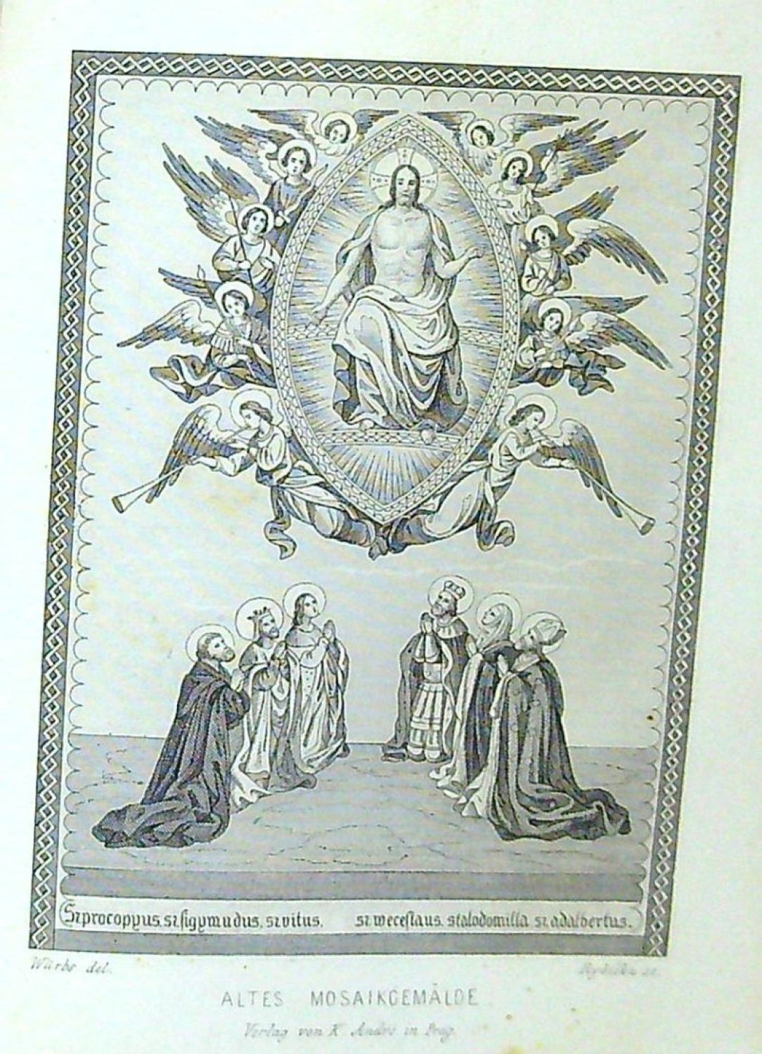 | Ilustrace: | Černě a červeně litografovaný tit. list se zmenšenou reprodukcí kapitulní pečetě, 12 ocelorytinových obr. příloh vč. frontispisu, rytých Rybičkou a Fescou podle Würbse, za s. 198 2 litografované přílohy s notací chorálu "Svatý Václave" s českým a německým textem, v textu 2 xylograf. vyobrazení. |