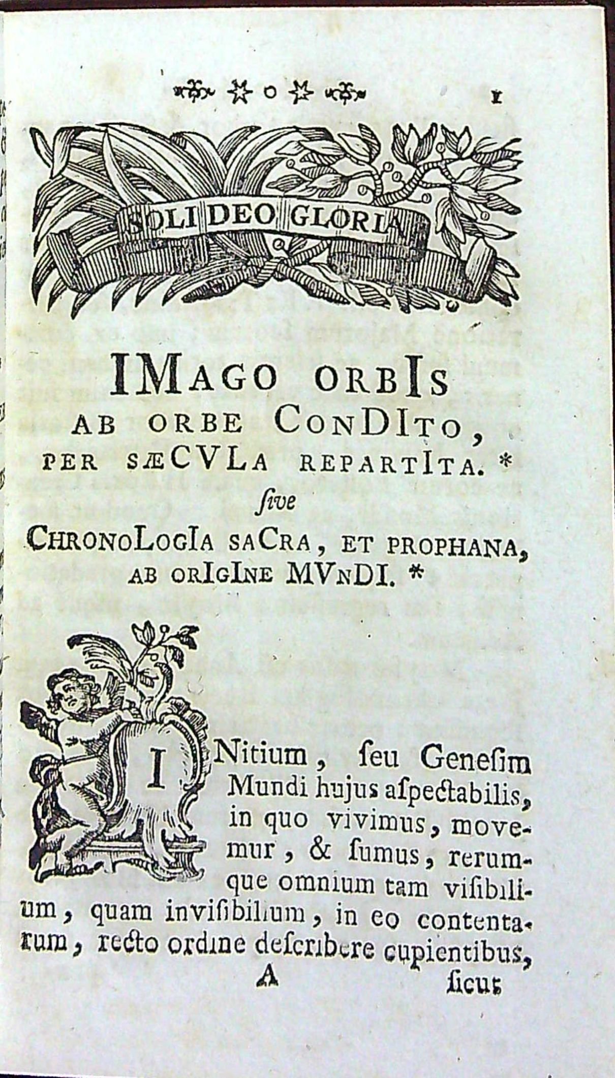 IMago orbIs ab orbe ConDIto, per saeCVLa repartIta. aC per breVes aphorIsMos hIstorICe DeLIneata. ID est: ILIas In nVCe CoMprehensa. sive ChronoLogIa saCra, et prophana ab orIgIne MVnDI. aD nostra pLane teMpora ContInVa serIe ILLIgata. (Pars I, Pars II)
