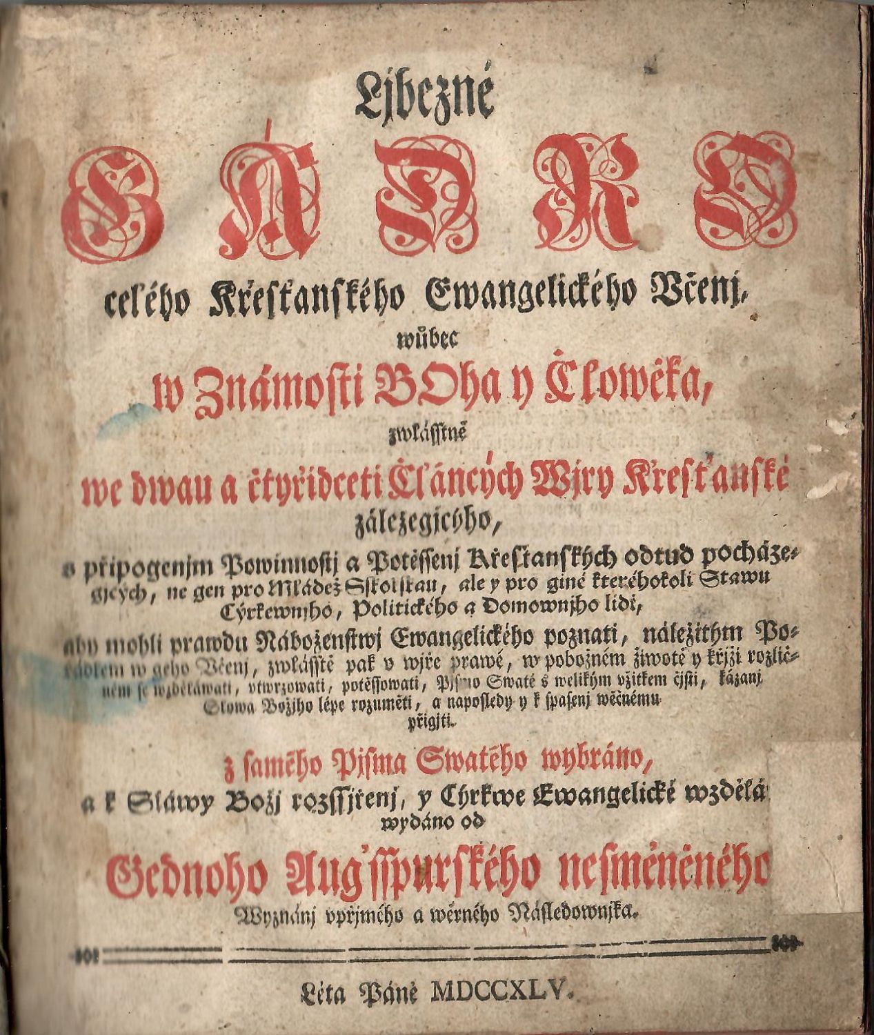 Ljbezné GÁDRO celého Křesťanského Ewangelického Učenj, wůbec w Známosti BOha y Člowěka zwlásstně we dwau a čtyřidceti Článcých Wjry Křesťanské záležegicýho, a připogenjm Powinnosti a Potěssenj Křesťanských odtud pocházegjcých, ne gen pro Mládež Sskolskau, ale y pro giné kteréhokoli Stawu Cýrkewnjho, Politického a Domownjho lidi, aby mohli prawdu Náboženstwj Ewamgelického poznati, náležitým Pořádkem w geho Učenj, zwlásstě pak v wjře prawé, w pobožném žiwotě y křjži rozličném se wzděláwati, utwrzowai, potěssowati, Pjsmo Swaté s welikým užitkem čjsti, kázanj Slowa Božjho lépe rozuměti, a naposledy y k spasenj wěčnému přigjti. z samého Pjsma Swatého wybráno, a k Sláwy Božj rozssjřenj, y Cýrkwe Ewangelické wzdelánj wydáno od Gednoho Augsspurského nesměněného Wyznánj upřjmého a wěrného Následownjka.