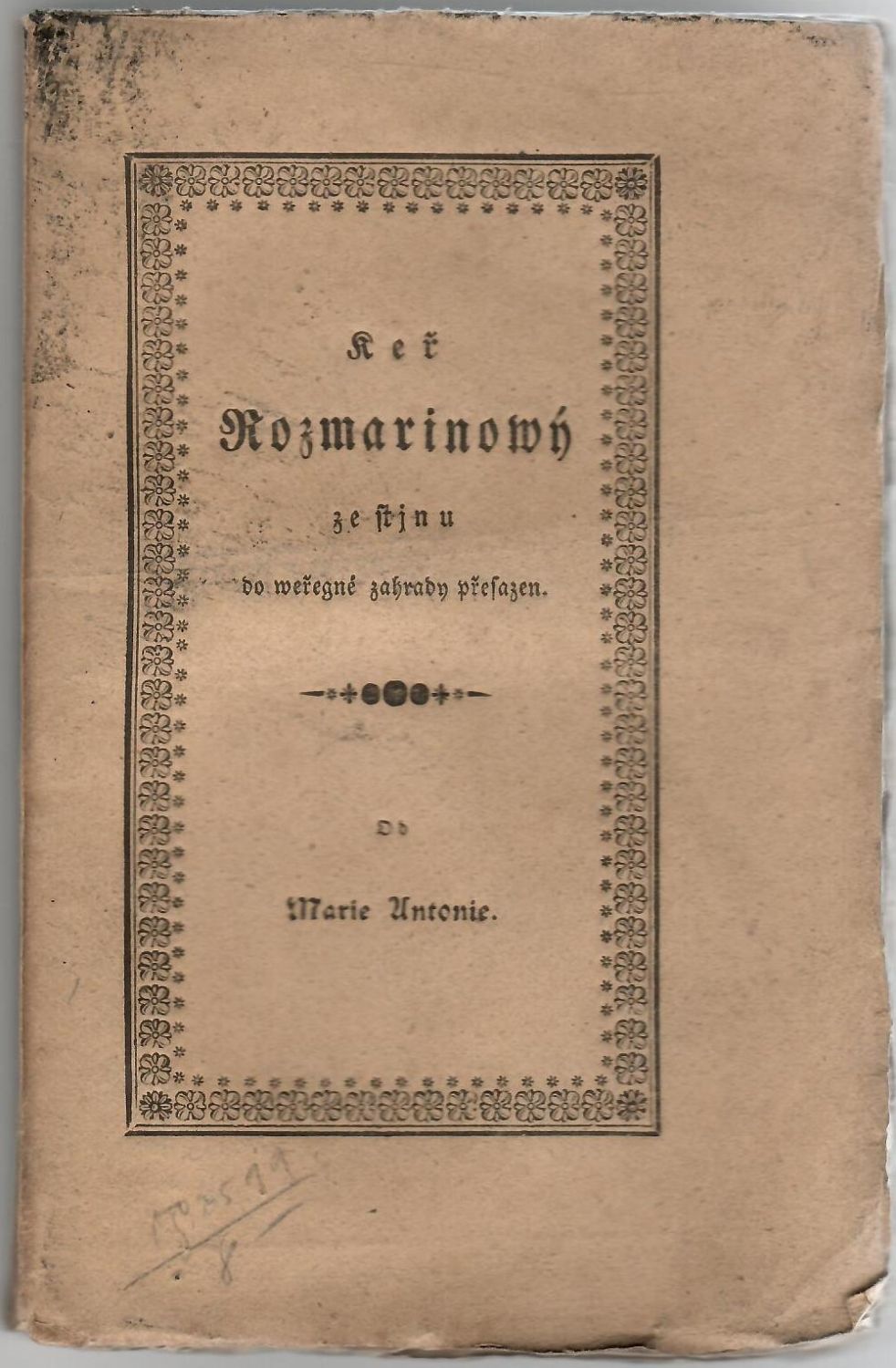 Jungmann VI,833c<br>Gotika, arabská paginace stran při horním vnějším okraji. <br>Původní papírová obálka, knižní blok šitý nití, nerozřezaný a neoříznutý. Obálka zašpiněná, poslední list (seznam knih vydaných Josefou Fetterlovou) potrhaný a zčásti přilepený k zadní straně obálky.<br>Marie Antonie jeptiška v klášteře alžbětinském v Praze, psala též pod jménem Dobrovlastka. Stýkala se o korespondenci udržovala s Zieglerem a J. V. Kamarýtem.