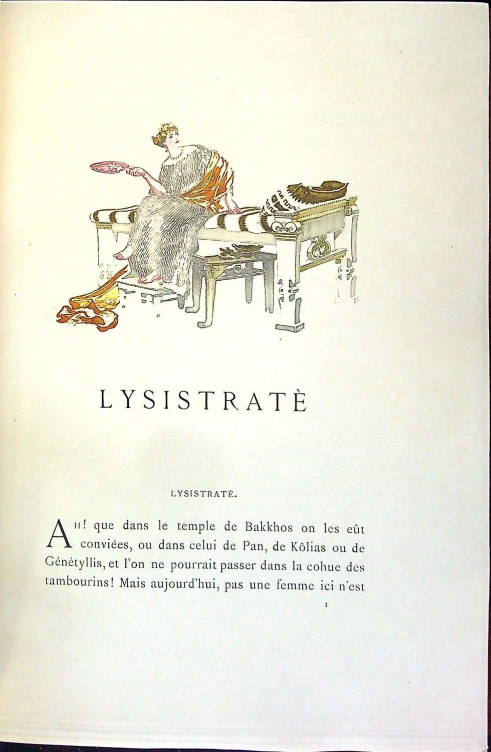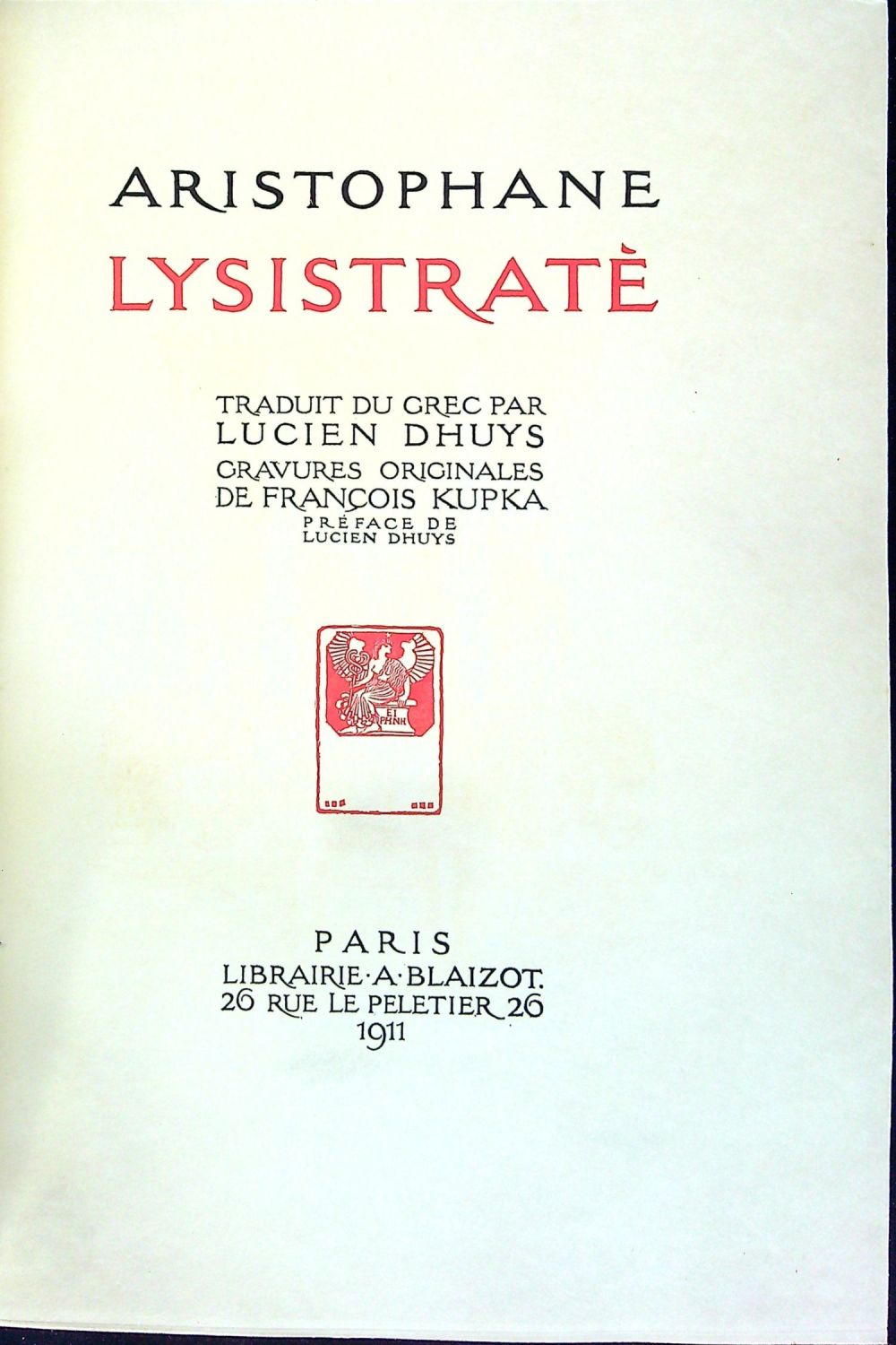 | Ilustrace: | František Kupka - v textu 19 barevných leptů o rozměru cca 85 x 125 mm, frontispis (180 x 125 mm, barevný lept), za tiráží 43 příloh s lepty (ilustracemi v textu) ve dvou stavech (krom front., který je ve 4 stavech, a 4. ilustrace, která je ve stavech třech). Většina přivázaných leptů je s vinětou (většinou barevnou), která na leptech v textu není. Poslední list je s leptem 1. ilustrace (s vyobrazením Lysistraty) a na jeho rubu tištěné oznámení o připravované bibliofilii "Prométheus" s Kupkovými lepty. |