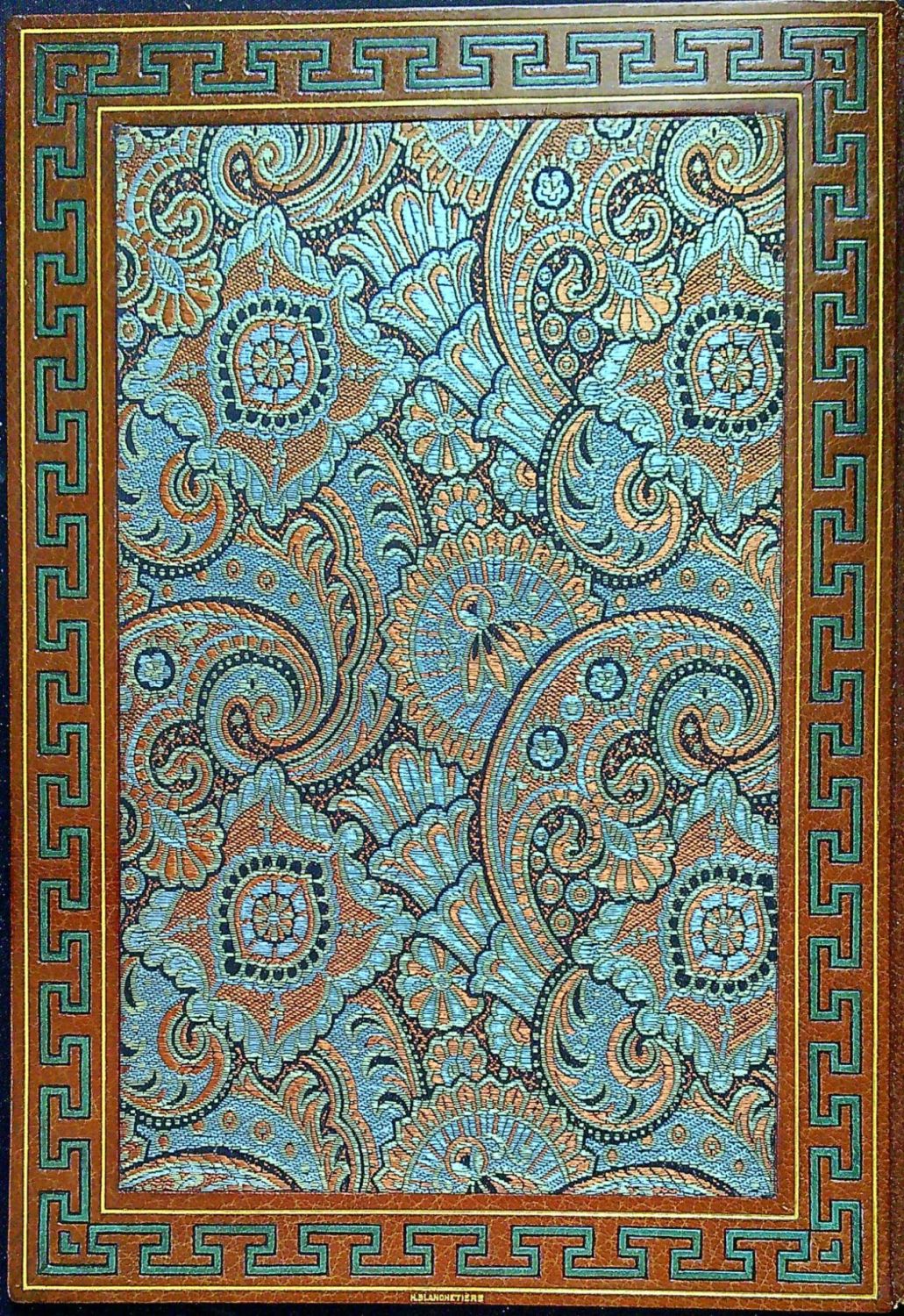 Exemplář č. 53 ze 100 exemplářů přednostního vydání tištěného na císařském japanu s celkem třemi stavy leptů (první v textu a druhé dva v příloze, druhý stav čistý lept, třetí barevný). Lepty vytiskl na ručním lisu Alfred Porcabeuf, typograficky upravil Philippe Renouard. (Krom toho vyšlo 150 ex. tištěných na velínu s jedním stavem leptů, 10 ex. v řeckém jazyce a jeden ex. s kresbami a akvarelem F. Kupky). Z řečtiny přeložil a úvodním slovem opatřil Lucien Dhuys. Červeno-černě tištěný tit. list s vinětou, v textu 12 drobných černobílých vinět.<br>Individuální kožená vazba (295 x 210 mm) od francouzského mistra knihvazače Henri Blanchetiére (1881-1933). Desky potažené hnědým marokénem, na přední desce tlačený klasicistní rám vyplněný modře barveným marokénem s tlačeným rostlinným ornamentem, na zadní desce stejný zmenšený rám, na přídeštích podél okrajů kožený hnědý pás s tlačeným temně modrým geometrickým ornamentem, uvnitř rámu šitý hedvábný pokryv s barevným ornamentem, na líci přední předsádky a na rubu zadní stejný hedvábný pokryv, na rubu a líci mramorovaný papír, který pokrývá přední i zadní vakát. Na předním přídeští uprostřed spodního okraje zlacené tlačené jméno autora vazby. Ve hřbetu 4 vazy, ve druhém poli tlačené a zlacené jméno autora knihy, ve čtvrtém název a při spodním okraji místo tisku a datace, v ostatních polích tlačený ornament. Původní ochranné kartonové pouzdro, uvnitř potažené světlou kůží a při hranách koženou hnědou páskou. Zlacené ořízky. Původní papírová obálka vevázána.