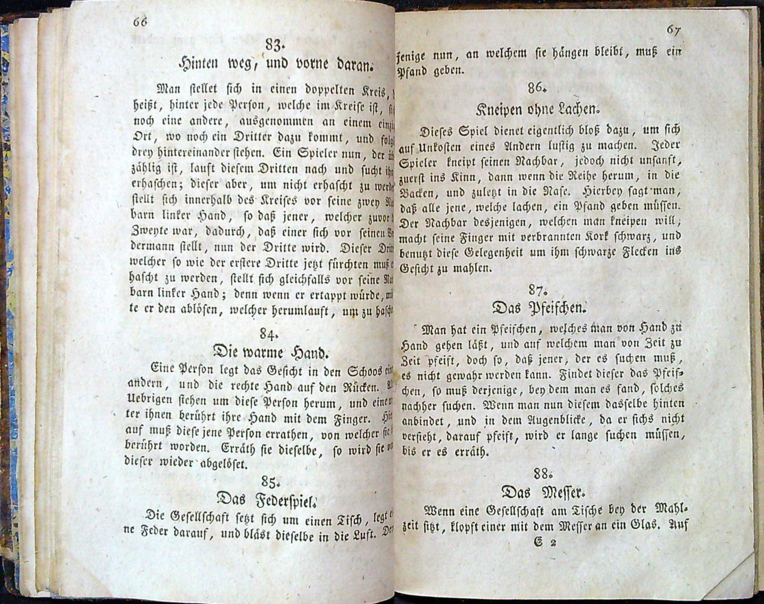 Tištěno švabachem, v úvodu předmluva vydavatelova datovaná leden 1808. Kniha obsahuje 155 popsaných kouzel a triků, které vydavatel čerpal z uvedených autorů. <br>Dobová kartonová vazba s deskami potaženými mramorovaným papírem, kožený hřbet a nárožnice, ve hřbetu jednotlivá pole dělená pásem z drobných ornamentů, ve druhém poli původní vínově červený kožený štítek s tlačeným a zlaceným názvem, ve čtvrtém poli zelený kožený štítek se stylizovaným tlačeným a zlaceným vyznačením dílu (1), v horním a spodním poli tlačené ozdůbky. Vazba ohmataná a zašpiněná, pap. pokryv místy lehce zkrabatělý, ve hřbetu v 5. poli kůže proděravělá. Na předsádkách a přídeštích dobový mramorovaný papír. Na několika listech oslí uši. - Pravděpodobně první díl ze tří celkem vydaných velmi vzácného vydání, které dle worldcat katalogu není kompletní v žádné světové knihovně. (Pouze jeden díl v polské Národní knihovně a jeden díl v americké Kongresové knihovně. <br>Jacob Philadelphia (14.8. 1735 Philadelphia - zemřel po roce 1795), vlastním jménem Jakob Meyer, americký kouzelník, od roku 1757 pobýval v Evropě (Anglii, Portugalsku, na dvoře Kateřiny II. v Petrohradu, v Německu, u Mustafy III. v Konstantinopoli). <br>Theodor Ferdinand Kajetan Arnold (4.4. 1774 Erfurt - 13.10. 1812 Erfurt), německý právník, spisovatel a varhaník. Publikoval též pod pseudonymy Agrippa von Nettesheim či Enslin jüngere. <br>Giovanni Giuseppe Pinetti (1750 v Toskánsku - cca 1803 pravděpodobně v Berdičevu na Ukrajině), profesor přírodní magie, na konci 18. století jeden z nejslavnějších kouzelníků své doby, stál také u zrodu reklamy na divadlo.