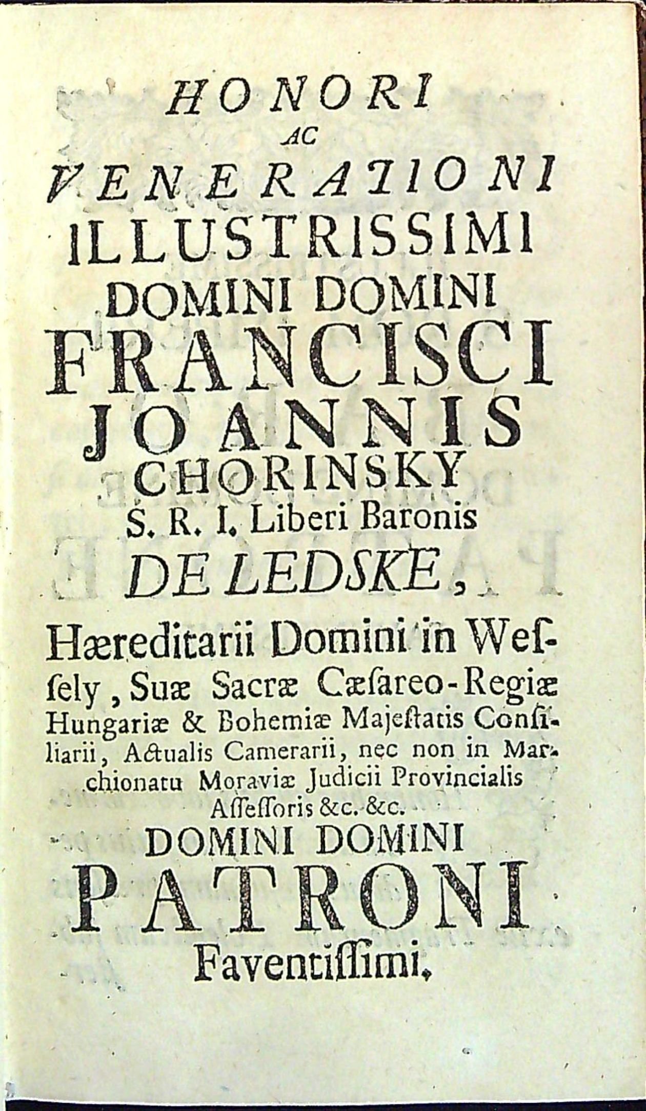 Živá záhlaví od sazby oddělená jednoduchou linkou, na začátku předmluvy autorovy a na začátku vlastního textu dvě ozdůbky z lastur zdobených kvítky a jedna na str. 29, jedna plná iniciála zakomponovaná v rostlinném věnci, plné tučně tištěné iniciály ve výši 2 řádků, dva pásové vlysy z rostlinného ornamentu s lasturou uprostřed, viněta s andílky držícími korunu s božím okem, koncová viněta s florálním motivem a uprostřed s elipsou se znakem jesuitského řádu, dvě ozdobné lišty z drobného ornamentu, tučně tištěné nadpisy.