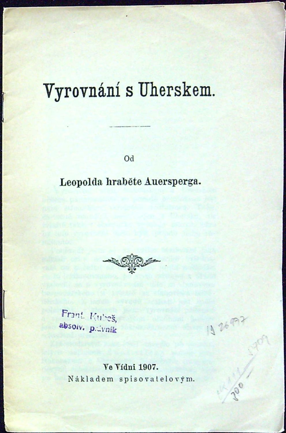 Knižní blok spojený dvěma kovovýma svorkami. Na tit. listu vlastnické razítko "Frant. Kubeš absolv. právník".