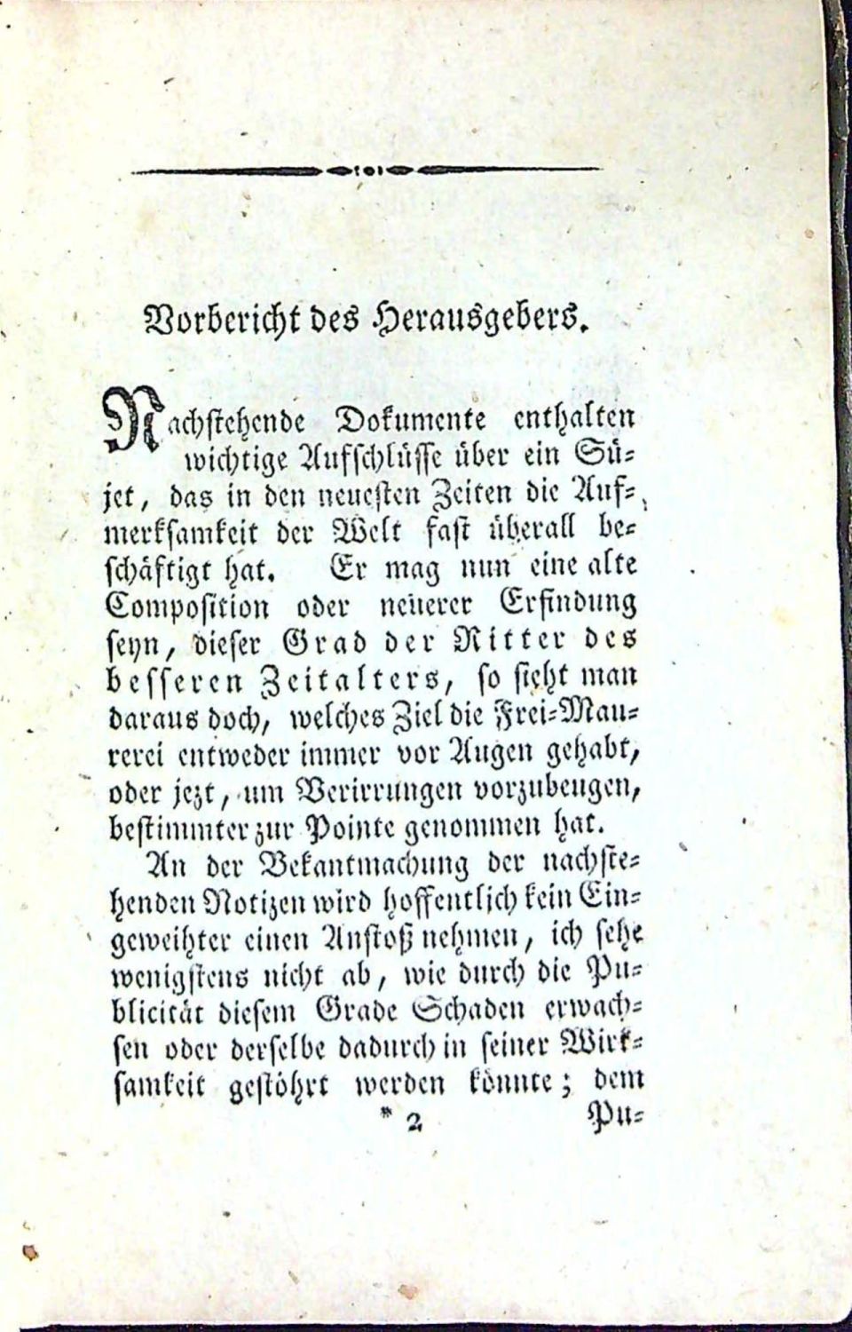 Wolfstieg 2031<br>Tištěno švabachem. V prvé části knihy korespondence mezi mladým a horlivým zednářem Augustinem a velmistrem všech lóží o účelu o konečném cíli svobodných zednářů. Od strany 40 kapitolky o ústavě, rituálu, katechismu, stavbě chrámu pro rytíře lepšího věku a jejich oblečení, ....<br>Dobová kartonová vazba, při horním okraji hřbetu dobový kožený štítek s tlačeným názvem, barvená svrchní ořízka. Vazba ohmataná a místy odřená, kožený štítek při okraji přední desky odtržený, na rubu přední předsádky tužkou anglický přepis titulního listu, při vnějším horním okraji tit. listu staré razítko neurčené zednářské lóže "K.M:".
