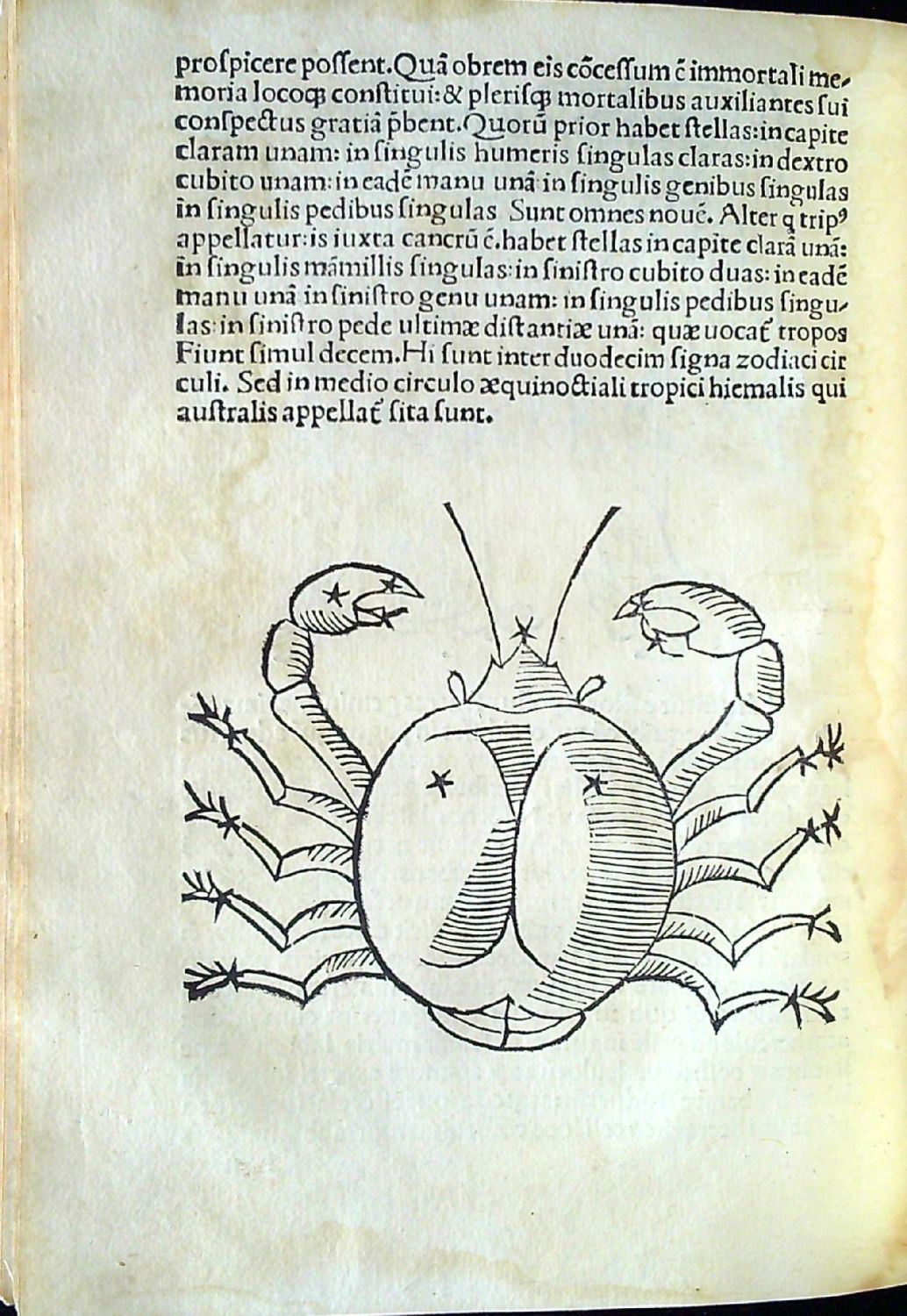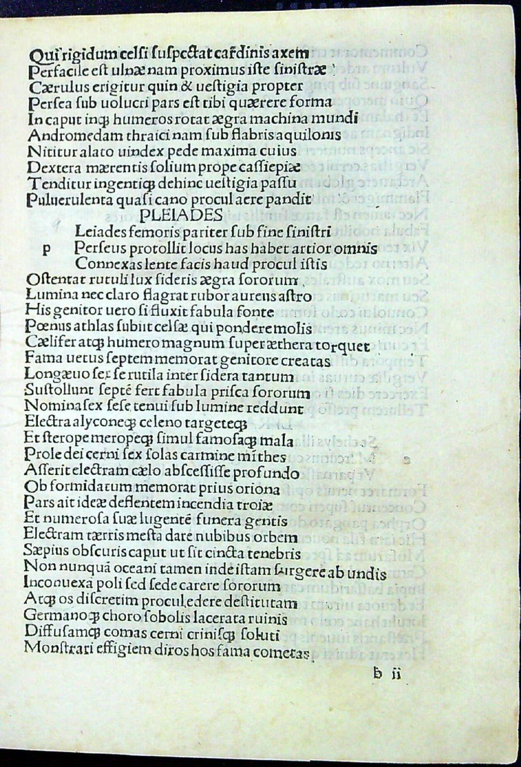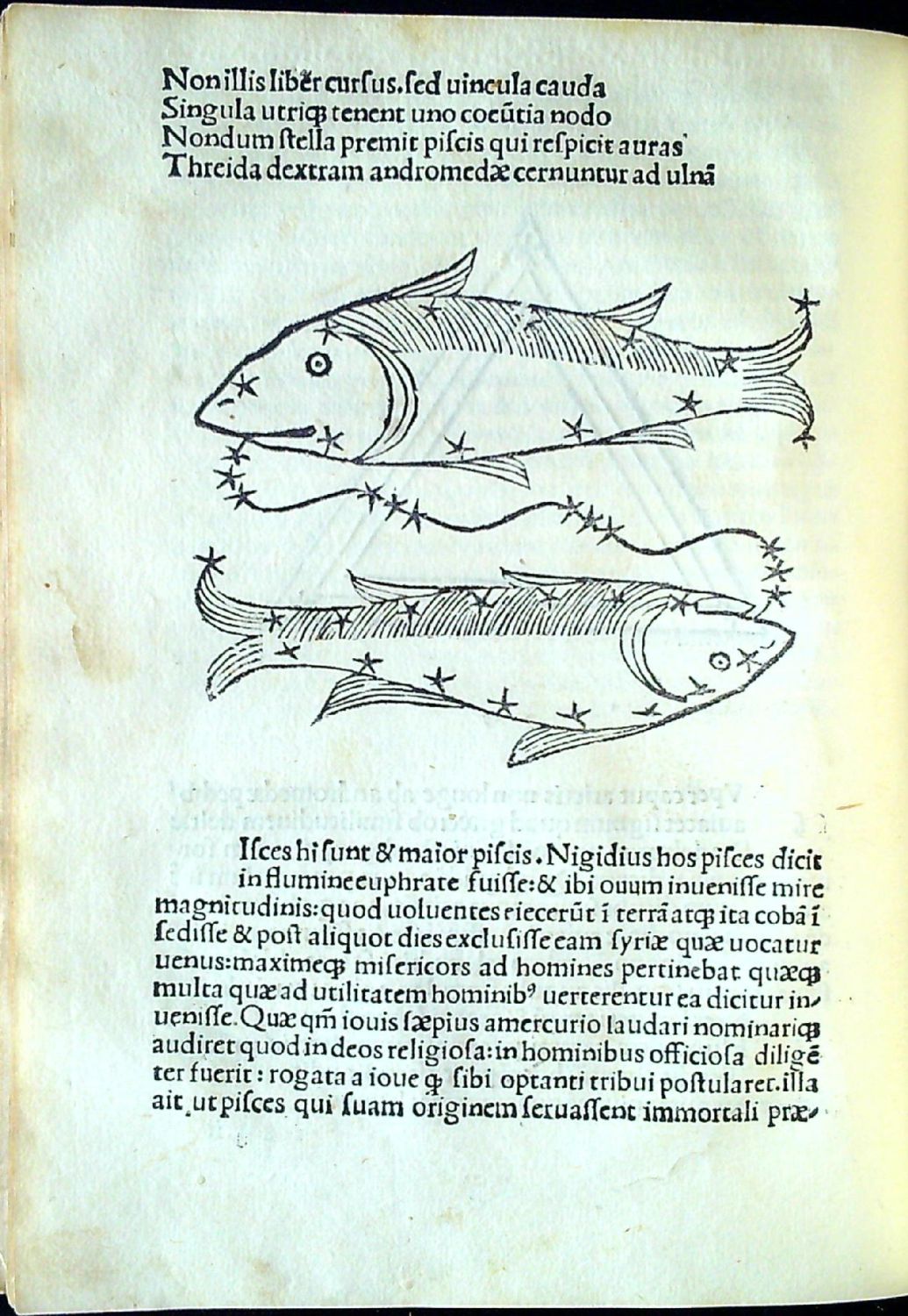 ISTC ia01432000; BMC V,294; GOFF A1432; HC 2224; GW 3131<br>Tisk antikvou ve 38 řádcích, nadpisy tištěné versálkami, vynechaná místa pro iniciály s předtištěnou reprezentantou pro rubrikátora. Nepaginováno (a10, b-p8 - folia a1, g8, p7-8 nepotištěná). V části Phaenomena v textu 38 dřevořezových ilustrací (na foliu H2a zvěrokruh, na dalších stranách alegorická vyobrazení zvířetníkových a jiných souhvězdí), které jsou zčásti stranově obrácenými kopiemi dřevořezů Thomase de Blavise, které vyšly poprvé v Benátkách u Ratdolta jako doprovod ke knize "Poetica astronomica" od Hyginuse v Benátkách roku 1485.<br> Kniha se skládá z několika částí: na foliu a2-3 dopis editora knihy Viktora Pisana Paulu Pisanovi, na foliu a4a-d3b Arati "Phaenomena" (v překladu Araviana), na foliu d3b-f6a Dionysius "Descriptio orbis terrae" (De situ orbis), na foliu f6a-g7a Avienus "Ora maritima", na foliu h1a-m8a Arati "Phaenomena" (v překladu Germanica), na foliu m8b-n6b Arati "Phaenomena" (v překladu Cicerona), na foliu n7a Quintus Serenus "Medicinae liber", na foliu p6a kolofon, na foliu p6b dopis Victora Pisana Paulovi Pisanovi.<br>Pergamenová vazba (194 x 145 mm, knižní blok 192 x 140) z konce 17. století. Chybí nepotištěná folia a1, p7-8, chybící folia a2,a3,p1,p2 jsou nahrazeny vevázanými faksimilemi pořízenými z exempláře Knihovny pražských premonstrátů, folio b1 ve spodní části utržené (cca 73 x 80 mm) a chybící část nově dolitá. Na několika listech při vnějším okraji hnědé skvrny způsobené vlhkostí, folia o3-o6 se světle hnědými mapami od vlhkosti.<br>Postumius Rufius Festus Avienus (4. století občanského letopočtu) latinský spisovatel a básník, překladatel z řečtiny. Jeho překlad Aratovy didaktické básně je nepřesný a překlad Dionýsova spisu, který v řeckém originále byl napsán v hexametrech stručným a elegantním stylem je přeložen do poněkud archaizující latiny.<br>Arátos či Aratos (315 až 240 před naším letopočtem), starořecký básník. Ve své didaktické epické skladbě "Fainomena" (Phaenomena, Nebeské jevy) shrnuje dobové astronomické vědění, v prvé zčásti dochované části popisuje stálice, planety a souhvězdí, v části druhé je výklad o předpovídání počasí. Popis hvězdné oblohy je střídmě protkán bájemi o vzniku hvězd. Dílo mělo velký ohlas a proto bylo již ve své době přeloženo třikrát do latinského jazyka (Cicero, Germanicus a Avienus).<br>Dionysius Periegetes, pocházel pravděpodobně z Alexandrie a žil v době císaře Hadriána v první polovině 2. století (někteří badatelé datují jeho život až na konec 3. století), jeho kniha "Descriptio orbis terrae" (Popis zemí světa) se těšila velké oblibě a již v dávných dobách sloužila jako školní učebnice. <br>Quintus Serenus Sammonicus (zemřel roku 212) byl římský učenec a učitel Gety a Caracally (některými badateli zřejmě mylně ztotožňovaný s významným lékařem, kterého nechal během hostiny zavraždit císař Caracalla). Jeho nejznámějším dílem je didaktická báseň "Liber medicinalis" (Lékařská kniha), která obsahuje řadu popisů různých léků, jedů a též řadu magických formulí, mimo jiné slavné abrakadabra.
