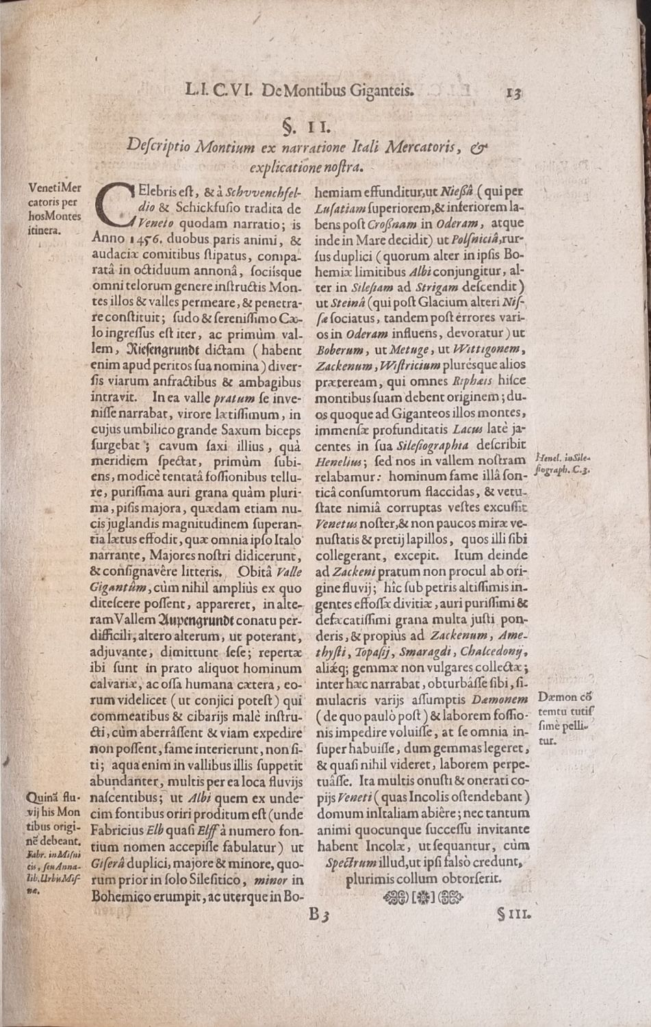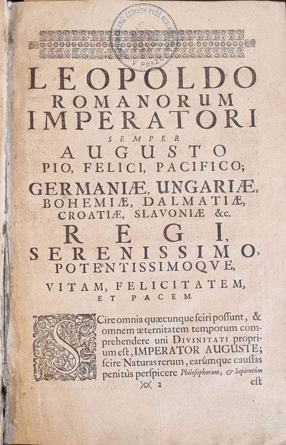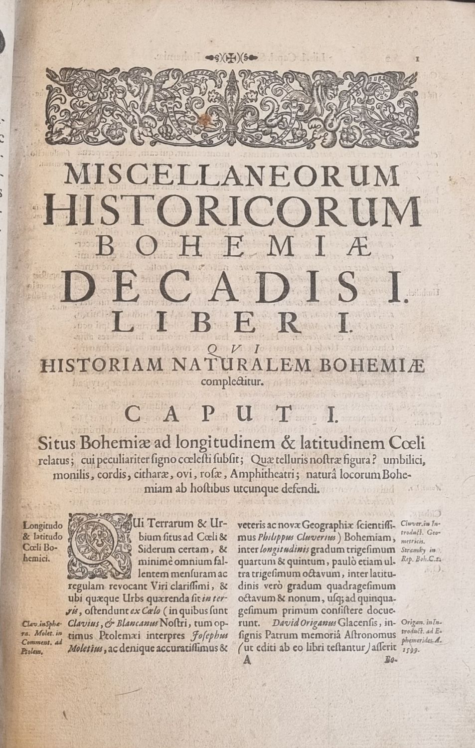 Rejzek 438; Zíbrt I,654, 1687, 2115; Zíbrt II, 1166 - 1168; Voit I, 0062; Backer-Sommervogel I, 799-802.<br>Latinský text antikvou, německý text a česká slova gotikou, řecká slova alfabetou, arabské stránkování ve vnějších horních rozích, dvousloupcová sazba, v textu řada dřevořezových iniciál na rostlinném pozadí ve výši pěti řádků, dřevořezové vlysy, ozdůbky, koncové viněty, na str. 176 nesign. mědirytina v textu (pták Zlatohlávek) o rozměrech 34 x 61 mm. <br> Bohužel chybí titulní list, který si patrně nějaký "milovník map" vytrhl neboť na jeho rubu byla v jednoduchém rámečku stylizovaná měděrytina Čech s pohořími, řekami a středovým panoramatem Prahy v kartuši nesené císařským orlem a Českým lvem signovaná Karlem Škrétou a SD (Samuelem Dvořákem st.) <br>Dobová kartonová vazba potažená mramorovaným papírem, podél hřbetu desky naprasklé, na předním přídeští staré knih. číslo, dvě stará kni. razítka "Knihovna cís. král. českých vyšš. realních škol v Praze", v samém závěru vystřižený malý proužek papíru patrně se starým podpisem perem jak je patrné ze zachovaného zbytku.<br>Kompletní Miscellanea ....(Historické rozmanitosti Království českého) obsahují dvanáct knih (1. dekáda deset a II. dekáda dvě knihy), z nichž za Balbínova života vyšlo jen deset. První kniha I. dekády je vlastně přírodopisem Čech (botanika, zvířena a vodopis), druhá kniha popisuje obyvatele a místní jména, třetí kniha je českým místopisem (Čechy, Morava, Slezsko a Kladsko)s mnoha folkloristickými a bájeslovnými prameny. Námi nabízený exemplář obsahuje pouze první knihu první dekády.