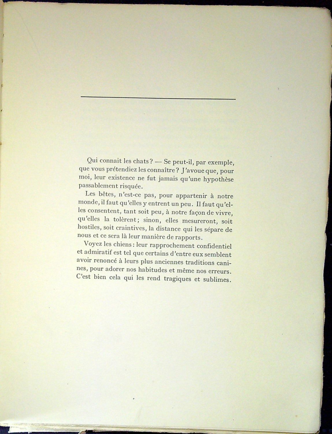 Úvodním slovem opatřil Rainer Maria Rilke, předmluva je datována v listopadu 1920. Za úvodním slovem 40 příloh s litografovanými reprodukcemi Balthusových kreseb. - Na trhu vzácně se objevující první Balthusem ilustrovaná kniha. Kresby vytvořil ve svých jedenácti letech v Ženevě roku 1919 pod vlivem četby taoistického myslitele Tchouang-Tseu s jehož filosofií ho seznámil Rainer Maria Rilke, který se stal milencem jeho matky a mladého autora podporoval v jeho výtvarném snažení.<br>Původní kartonová vazba s původní pap. obálkou s chlopněmi, obálka zašpiněná, na přední straně utržený při spodním vnějším okraji kus papíru, papír ve hřbetu potrhaný a místy chybí, zadní strana obálky podél hřbetu potrhaná. Na přední předsádce a předním palistu stará razítka "Bibliothek d. Isr. Kultusgemeinde Troppau", podpis tužkou Jiřího Šalamouna.<br>Balthus, vlastním jménem Balthasar Klossowski de Rola (29.2. 1908 Paříž - 18.2. 2001 Rossiniere), polsko-francouzský malíř, jeho matka Baladine byla intimní přítelkyní Rilkeho od roku 1919 až do jeho smrti v roce 1926.