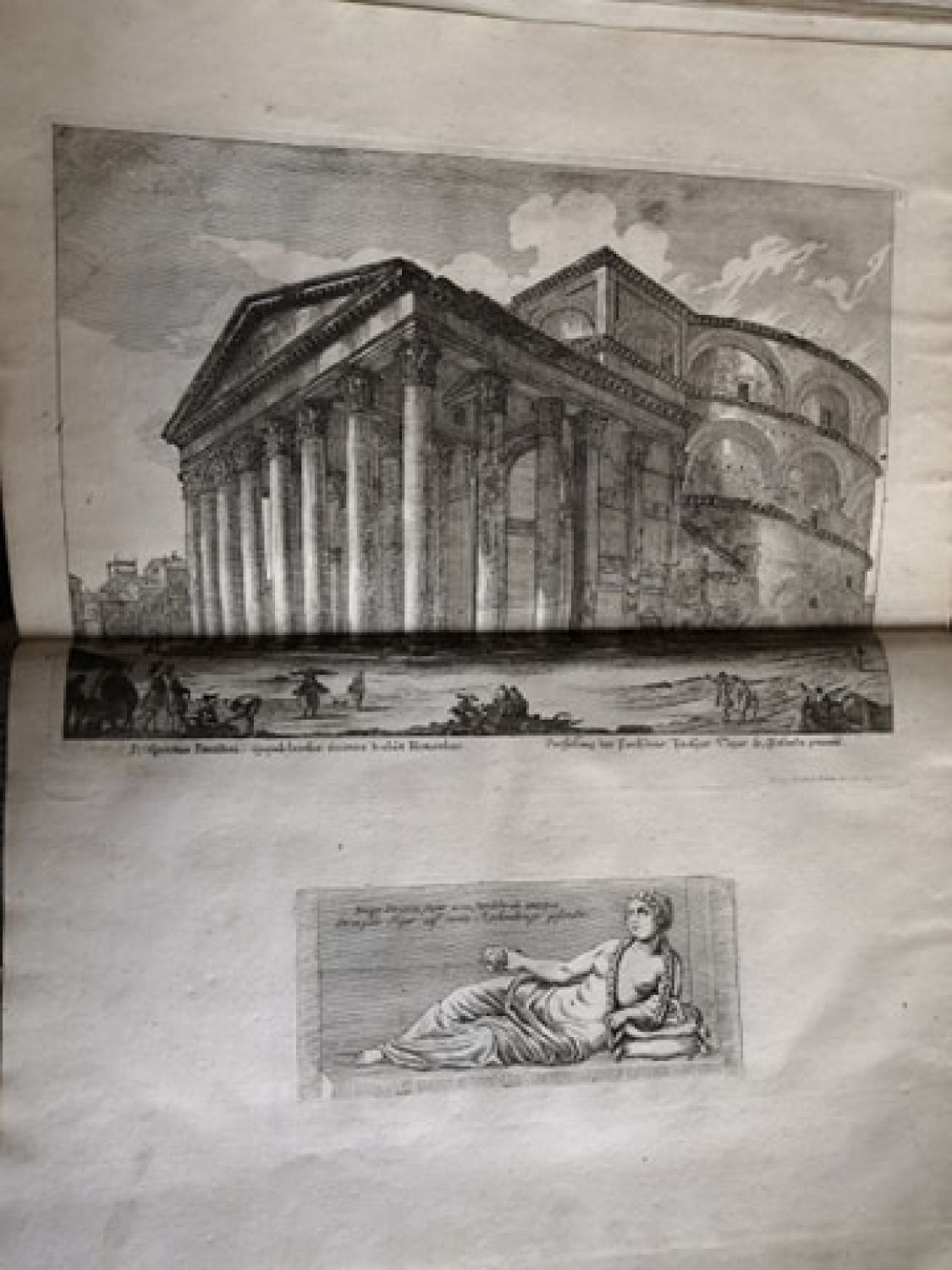 Fromm 1755; Ebert 1619<br>Německý text gotikou, latinský antikvou, dřevořezové viněty a vlys na posledním tištěném listu (rejstřík), na první straně textu při horním okraji mědirytina v jednoduchém rámečku o rozměru desky 95 x 175 mm, za úvodním textem 57 dvoustránkových tabulí (z 60 tři chybí) s mědirytinami G. Ch. Kiliana, na kterých jsou vyobrazeny ruiny památek z doby antického Říma, pod některými též vyobrazení detailů a fragmentů sochařské a malířské výzdoby a vlysů. Tabule jsou číslovány 1-6; 1-54. Georg Kilian mědirytiny vytvořil podle kreseb Jeana Barbaulta, původní francouzské vydání vyšlo roku 1761.<br>Dobová kartonová vazba, ohmataná a místy odřená, při spodním i horním okraji hřbetu chybí kousek pap. pokryvu, naražené rohy. <br>Georg Christoph Kilian ( 4.1. 1709- 15.6. 1781 Augsburg), německý rytec z významné rodiny rytců tvořících po generace v německém Augsburgu.