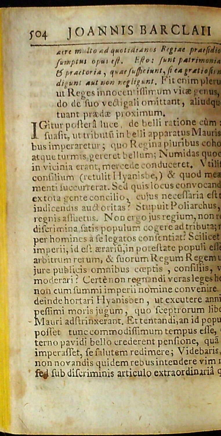 VD 18, 14391333<br>Červeno-černě tištěný titulní list, živá záhlaví od sazby oddělené jednoduchou linkou, tučně tištěné versálky ve výši 2-3 řádků, pásové ozdobné lišty, jednoduché linky, viněty. <br>Vazba z konce 19. století, kartonové desky potažené mramorovaným papírem, kožený hřbet a nárožnice, ve druhém poli hřbetu červený kožený štítek s tlačeným a zlaceným názvem, ve třetím poli štítek chybí, žlutě barvené ořízky. Front. při vnějším okraji svisle podlepený, při spodním vnějším okraji chybí kousek rytiny (vyspraveno dolitím), zadní deska vazby v horní polovině rozvolněná od knižního bloku, na přední předsádce podpis Jiřího Šalamouna tužkou.<br>John Barclay (28.1. 1582 Pont-a-Mousson v Lorraine - 15.8. 1621 Řím), skotský básník a satirik. Narodil se ve Francii skotskému otci a francouzské matce. Jeho nejznámějším dílem je "Euphormionis Satyricon", jehož první část vyšla roku 1605 a byla namířena proti jesuitům, druhá část vyšla roku 1607 v Paříži, třetí roku 1611 jako odpověď na útoky jesuitů a čtvrtá roku 1614 pod názvem "Icon animorum", ve které autor popisuje chování a charakter evropských národů.