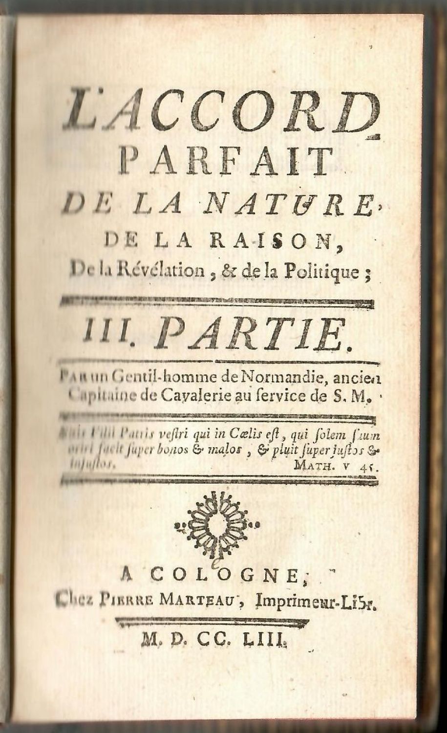 L´accord parfait de la nature, de la raison, De la Révélation, & de la Politique; ou traite dans lequel on etablit. Que les voyes de riguer, en matiere de Religion, blessent les droits de l´humanité, et sont egalement contrires aux lumieres de la raison, a la morale Evangelique, et au vératible intéret de l´Etat.