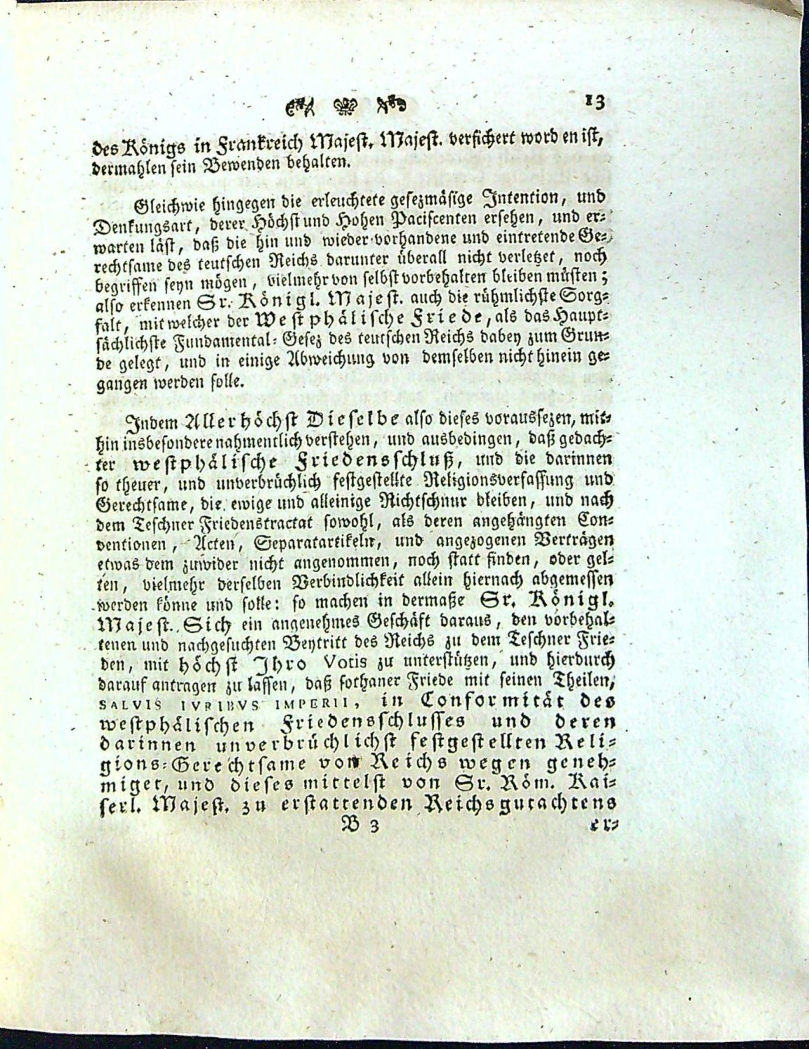 BCBT 12021<br>Německý text švabachem, francouzská a latinská slova antikvou. Na tit. listu rokoková viněta, impresum pod ozdobnou tyčí, uprostřed horních stran drobné rostlinné ozdůbky, v záhlaví strany 3 rokokový pásový vlys, ozdobné mizící tyče, vstupní tučně tištěná iniciála zalomená do výše 3 řádků. Od strany 33 druhý sešit, průběžná paginace. - Původní brožura přes hřbet přelepená pap. páskou.<br>Těšínský mír byl uzavřen 13. května roku 1779 v Těšíně v den narozenin císařovny Marie Terezie za účasti delegátů sedmi zúčastněných zemí (Rakouska, Pruska, Saska, Bavorska, Francie, Ruska a vévodství Zweibrücken). Těšínská mírová smlouva ukončila řadu válek vedených od roku 1740 pruským králem Bedřichem II., bavorským a saským kurfiřtem a polským králem Augustem II. proti habsburské monarchii.