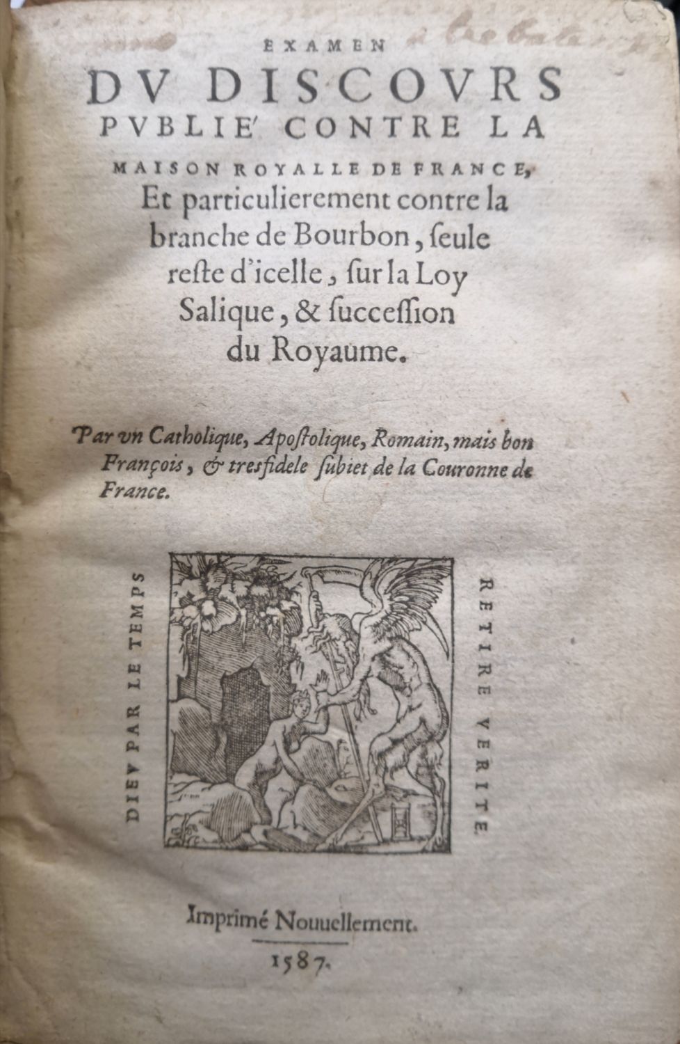 Dobová pergamenová vazba, zašpiněná a ohmataná, při okrajích mírně zkrabatělá a zvlněná, na hřbetu inkoustem napsaný věcný název. chybí tkanice stahující vazbu, při okrajích vazby se z nich dochovaly pouze nepatrné stopy. Na tit. listu dřevořezová viněta, v textu dřevořezové ozdobné lišty, papír místy zvlněný, místy hnědé skvrnky, na listu č. 3 v pravém horním rohu chybí kousek papíru, list č. 2 při svém horním okraji podélně oříznut (cca 0.5 cm), text však nechybí, místy nepatrné stopy, které zanechal červotoč. Chybná paginace (zdvojené číslování str. 167-176). Ve stavu slušném.<br>První vydání anonymně vydané práce o následnickém pořádku na francouzském trůně od Pierra de Belloy (okolo roku 1540 Montauban - 1612 Toulous), francouzského právníka a politika, hlavního advokáta parlamentu v Toulous, přívržence rodiny Bourbonů, obhájce práv Jindřicha IV.<br>Ohne Ort und Verleger (La Rochelle, Pierre Haultin), 16 Bl., S.17-355, (1 unbedr.). Orig. Pergamentband der Zeit, Deckel etwas gebogen, handgeschr. Titel auf dem Rücken, ohne die Bindebänder.<br>Erste Ausgabe dieser anonym erschienen Schrift über die Thronfolgeordnung Frankreichs, sog. "Loi salique". - Paginierung fehlerhaft - S. 1-16 als Blätter numeriert, S. 167-176 doppelt num. Quadratische Hlzschn.-Druckermarke auf dem Titel mit der Devise "Dieu par le temps, Retire verite". Vorsätze etwas schmutzig. Titel mit unlesbarem Vermerk, vom nächsten Blatt oben etwa 0.5 cm breiter Streifen abgeschnitten, vom dritten Bl. oberes Eckchen abgerissen. Stellenweise leicht gebräunt, gegen Ende winzige Wurmspuren im weissen Rand.<br>Barbier II,355; Adams B,546.<br>Pierre de Belloy (geb. um 1540 Montauban, gest. 1612 Toulons) war französischer Jurist und Politiker, General-Advokat des Parlaments in Toulons. Anhänger der Familie Bourbon, Verteidiger der Rechte Heinrichs IV., König zu werden.