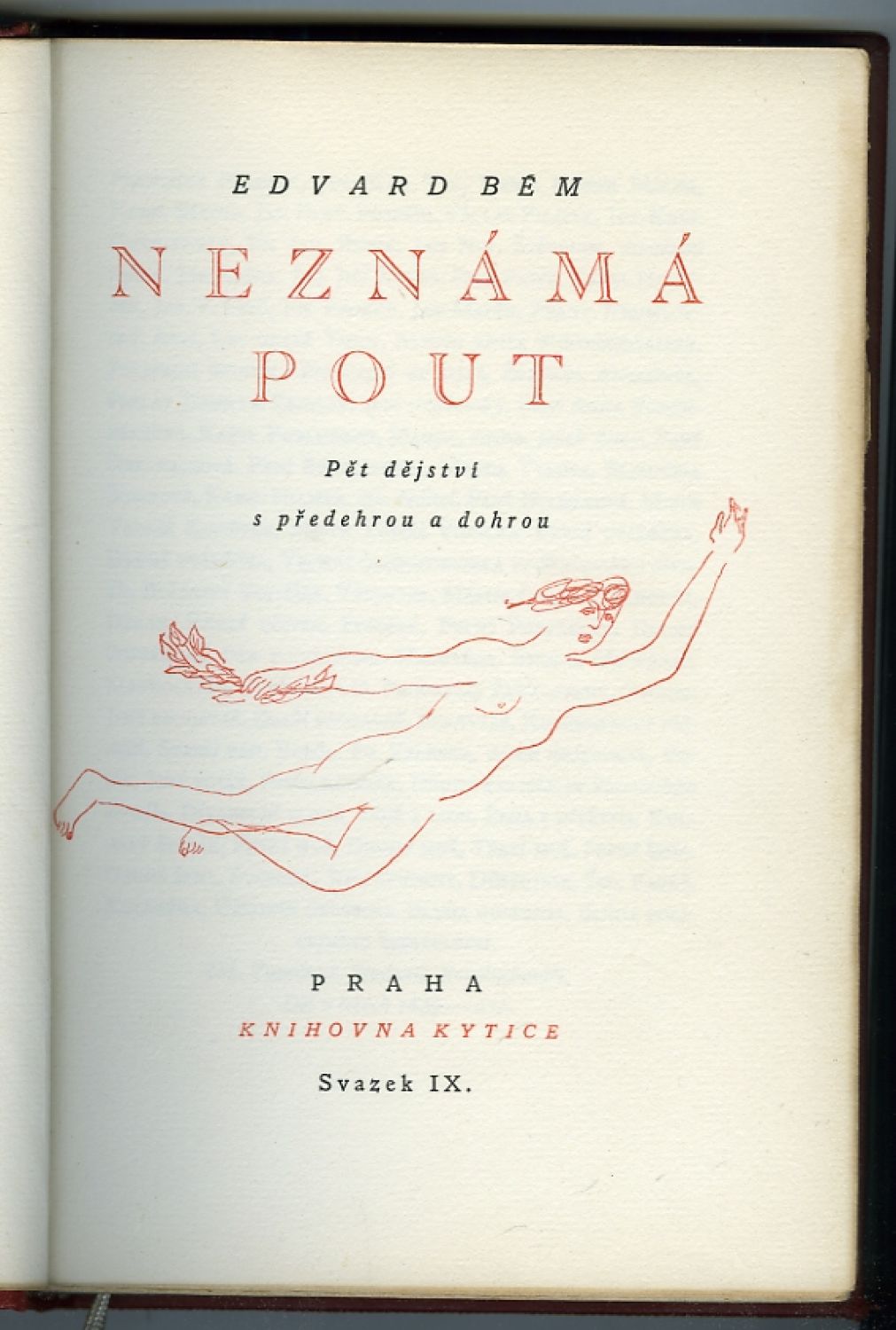 Ex. č. 92 ze 100 výtisků přednostního vydání tištěného typy Veronese na holandský papír, vytiskla Průmyslová tiskárna v Praze. Dvoubarevně tištěný titulní list. V tiráži podpis autora.<br>Dobová vínově červená vazba z teletiny, ve hřbetu 5 vazů, ve druhém poli tlačené a zlacené jméno, v pátém název, v ostatních polích tlačené a zlacené ozdůbk z lístků. Zlacená svrchní ořízka, ostatní strany knižního bloku neoříznuté, šitý kapitálek. Vazna lehce odřená.