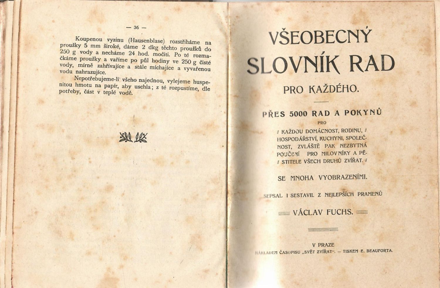 Kniha vyšla v Knihovně milotického hospodáře.<br>+ přívazek: Fuchs, Václav "Všeobecný slovník rad pro každého. Přes 5000 rad a pokynů pro každou domácnost, rodinu, hospodářství, kuchyni, společnost, zvláště pak nezbytná poučení pro milovníky a pěstitele všech druhů zvířat". Praha, nákl. časopisu Svět zvířat, tiskem E. Beauforta, [1906], 704 (z 1396 stran). Text končí u písmene M a hesla "Mor". V textu několik černobílých vyobrazení.