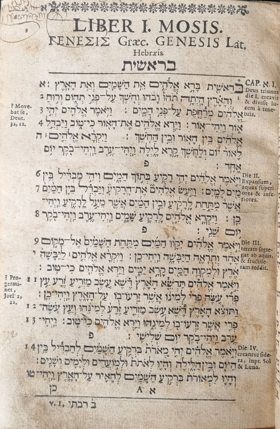 Úvodní poznámky tištěny latinsky, SZ hebrejsky, tištěné poznámky po stranách latinsky, pod textem hebrejsky, živá záhlaví, vstupní konturová iniciála na rostlinném pozadí zalomená do výše 6 řádků, ozdobné tyče z rostlinného ornamentu, viněta. V kolofonu druhé impresum, ve kterém je krom výše uvedeného nakladatele zmíněn ještě Joann Koelner.<br>Dobová vazba z hnědé hověziny, ve hřbetu 3 vazy, vazba místy odřená, naražené rohy. Titulní list na rubu při vnějším okraji podlepený pap. páskou (na jeho líci páska vykrývá chybící spodní okraj tit. listu), úvodní latinský text oříznutý po samý okraj tisku, v závěru podlepené při spodním okraji dva listy hebrejského rejstříku. Na tit. listu a na listu posledním staré nečitelné poznámky perem.