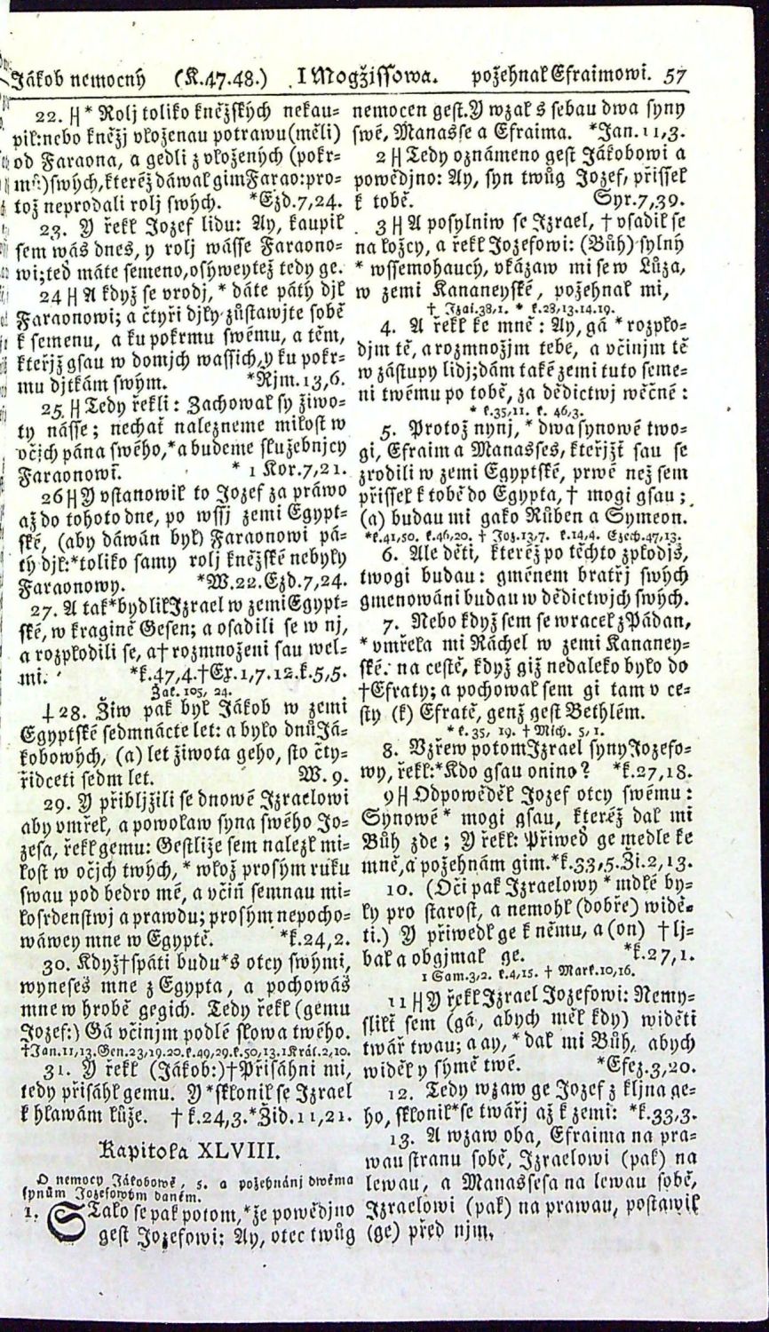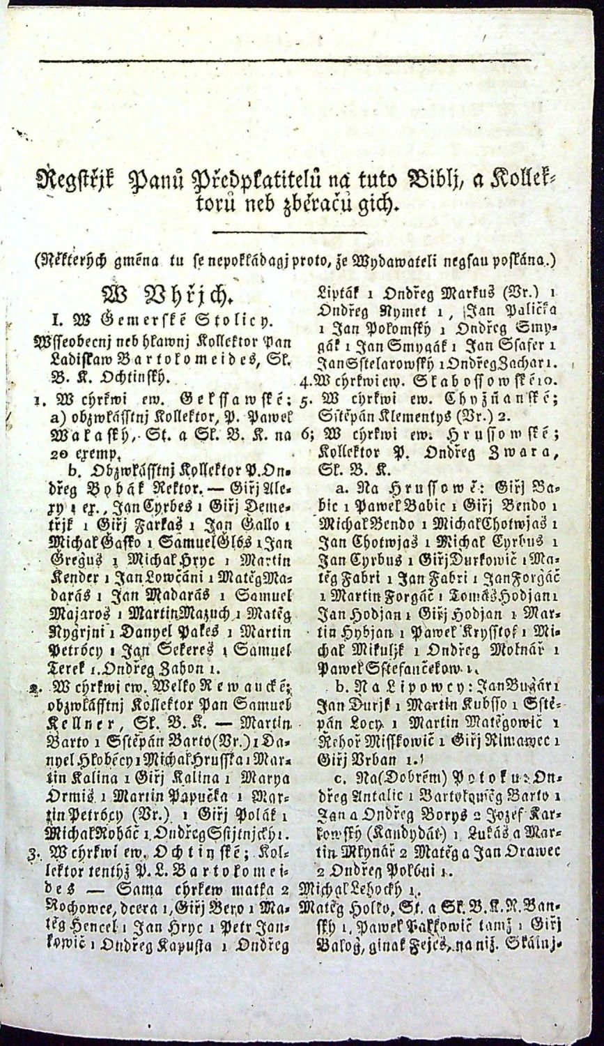 Knihopis 1118<br>Tištěno švabachem ve dvou sloupcích, živá záhlaví od sazby oddělená jednoduchou linkou. Červeno-černě tištěný titulní list s mědirytinovou vinětou, vstupní prolamovaná ozdobná tyč, plné iniciálky zalomené do výše 2 řádků. Za titulním listem na dvou listech seznam předplatitelů.<br>Dobová vazba, kartonové desky potažené mramorovaným papírem, kožený hřbet a nárožnice, ve hřbetu pole dělená ozdobnou tlačenou a zlacenou linkou, ve druhém poli světle hnědý kožený štítek s tlačeným a zlaceným názvem, ve čtvrtém poli stejný štítek (odřený, v ostatních polích tlačený ornament. Na rubu tit. listu stará vlastnická značka "JB". Vazba ohmataná a místy odřená, naražené rohy. - Pouze Starý Zákon.