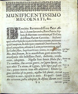 Tištěno švabachem, latinský text antikvou, živá záhlaví od sazby oddělená jednoduchou linkou, tištěné poznámky po stranách, vstupní vlys, pásové lišty a tyče z ornamentů, konturové iniciály na rostlinném a ornamentálním pozadí zalomené do výše 2-4 řádků, plná iniciála na rostlinném pozadí zalomená do výše 7 řádků, iniciály propletené úponky zalomené do výše 2-3 řádků, viněty. Na titulním listu a dalších třech listech stále se opakující chronogram s datem tisku.