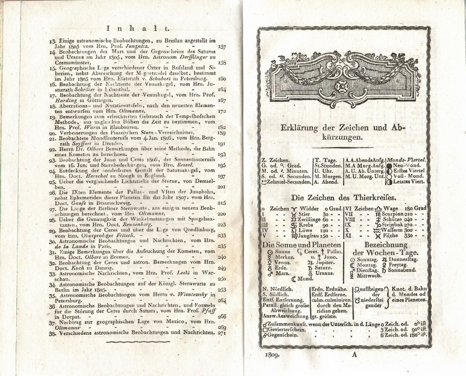 Astronomisches Jahrbuch für das Jahr 1809. nebst einer Sammlung der neuesten in die astronomischen Wissenschaften einschlagenden Abhandlungen, Beobachtungen und Nachrichten.