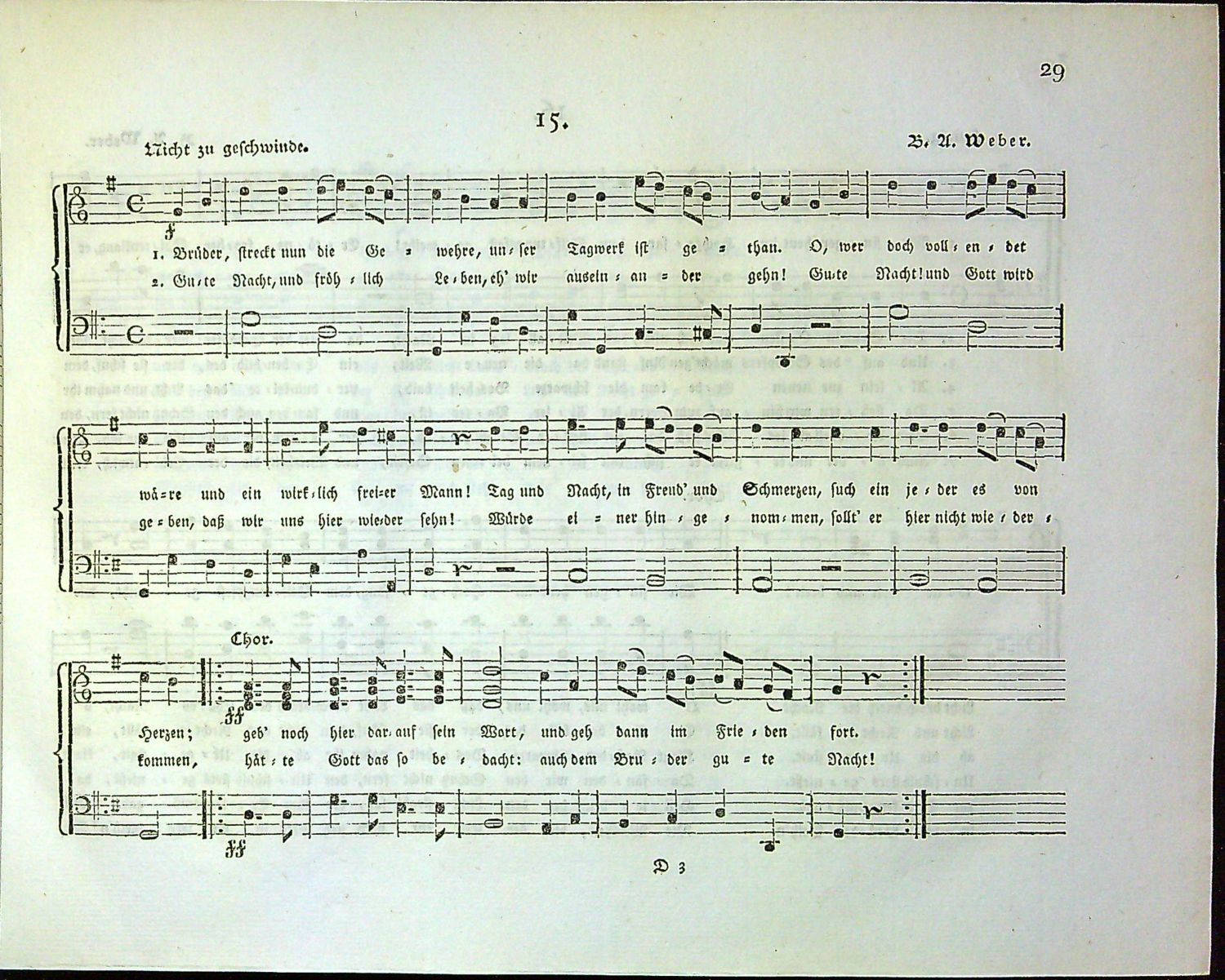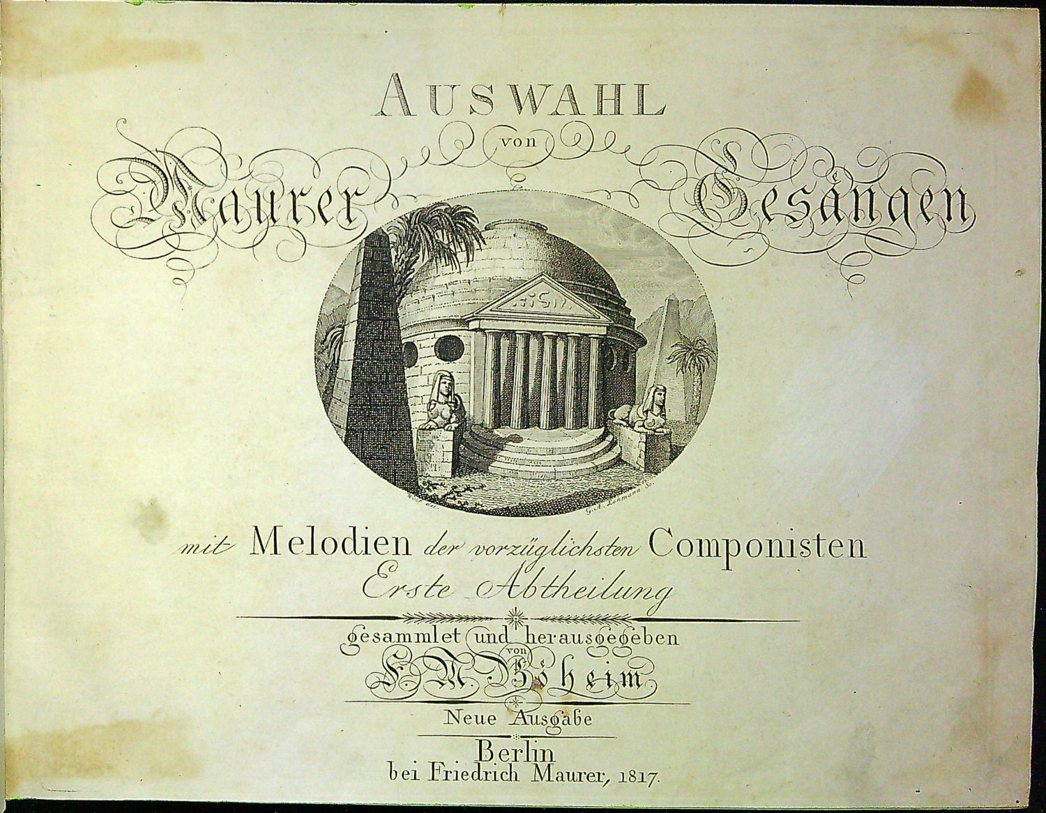 Eitner II, 85; Wolfstieg 39844<br>Podlouhlý 4° (205 x 270 mm), texty písní tištěny švabachem, titulní listy antikvou, tištěná notace celkem 215 zednářských písní. V obou dílech za titul. listy tištěný seznam subskribentů a úvodní slovo vydavatele Fr. Maurera. <br> Dobová vazba s kartonovými deskami potaženými mramorovaným papírem, kožený hřbet a nárožnice, ve hřbetu 4 vazy olemované jednoduchou zlacenou linkou, ve druhém poli zlacený název, zeleně barvené ořízky, vazba lehce odřená, mírně naražené rohy<br>Joseph Michael Böheim (cca 1750 Praha - 4.7. 1811 Berlín) operní pěvec, herec v činohře a básník, první angažmá získal v Hamburku (1773-77), poté působil dva roky ve Vratislavi a od roku 1779 různá angažmá (Berlín, Schwedt, Frankfurt), od roku 1789 v Národním divadle v Berlíně. Byl členem berlínské zednářské lóže "Zur Beständigkeit".