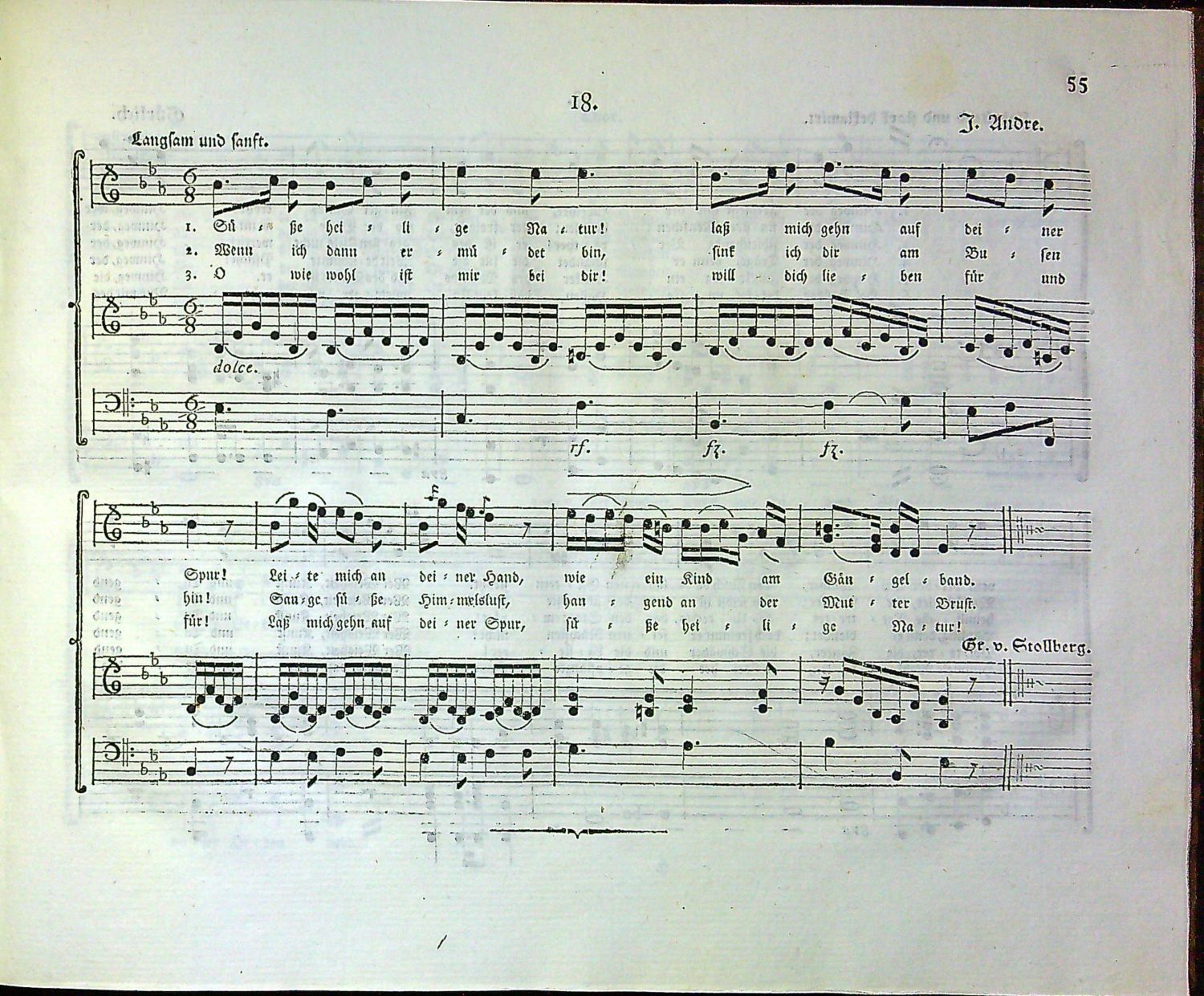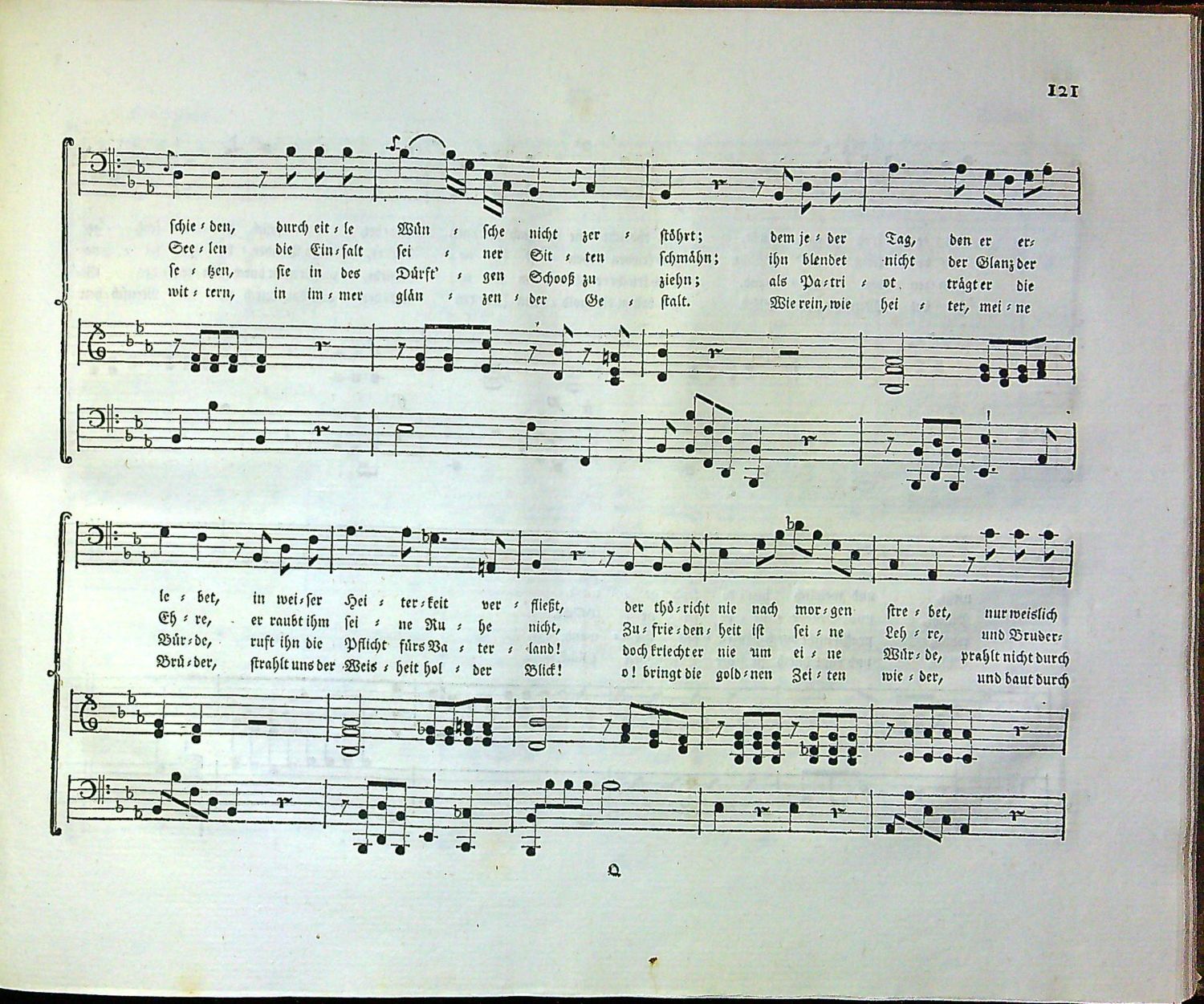 Eitner II, 85; Wolfstieg 39844<br>Podlouhlý 4° (220 x 265 mm), texty písní tištěny švabachem, titulní listy ryté antikvou, tištěná notace celkem 202 zednářských písní (v prvním svazku 78, ve druhém 124).<br>Mramorovaná kožená vazba, na deskách ozdobný rám z tlačeného a zlaceného ornamentu, uvnitř rámu na předních deskách kulaté zrcadlo z ornamentů, uvnitř zrcadla iniciály prvního vlastníka a objednatele vazby "J.C.C.M" a letopočet 1808, zlacené ořízky, na přídeštích a předsádkách dobový tragantový papír. Hřbet dělený dvojitými linkami, ve druhém poli vínově červený kožený štítek s názvem, ve čtvrtém poli zelený oválný medailonek s vyznačením dílu. Vazba ve hřbetu lehce odřená a vyšisovaná. Původní ochranná kartonová pouzdra, odřená a místy potrhaná.br>Joseph Michael Böheim (cca 1750 Praha - 4.7. 1811 Berlín) operní pěvec, herec v činohře a básník, první angažmá získal v Hamburku (1773-77), poté působil dva roky ve Vratislavi a od roku 1779 různá angažmá (Berlín, Schwedt, Frankfurt), od roku 1789 v Národním divadle v Berlíně. Byl členem berlínské zednářské lóže "Zur Beständigkeit".