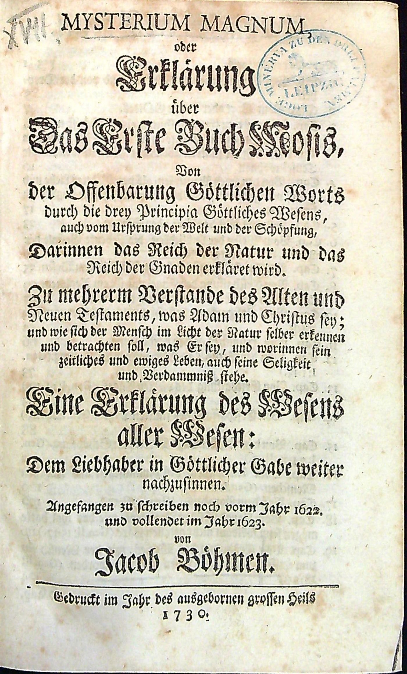 MYSTERIUM MAGNUM, oder Erklärung über Das Erste Buch Mosis, Von der Offenbarung Göttlichen Worts durch die drey Principia Göttliches Wesens, auch vom Ursprung der Welt und der Schöpfung, Darinnen das Reich der Natur und das Reich der Gnaden erkläret wird. Zu mehrerm Verstande des Alten und Neuen Testaments, was Adam und Christus sey; und wie sich der Mensch im Licht der Natur selber erkennen und betrachten soll, was Er sey, und worinnen sein zeitliches und ewiges Leben, auch seine Seligkeit und Verdammniss stehe. Eine Erklärung des Wesens aller Wesen: Dem Liebhaber in Göttlicher Gabe weiter nachzusinnen. Angefangen zu schreiben noch vorm Jahr 1622. und vollendet im Jahre 1623. von ...