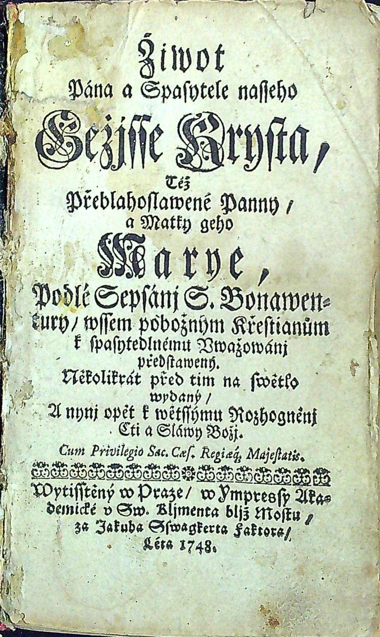 Žiwot Pána a Spasytele nasseho Gežjsse Krysta, Též Přeblahoslawené Panny, a Matky geho Marye, Podlé Sepsánj S. Bonawentury/ wssem pobožným Křestianům k spasytedlnému Vwažowánj předstawený. Několikrát před tim na swětlo wydaný/ A nynj opět k wětssýmu Rozhogněnj Cti a Sláwy Božj.