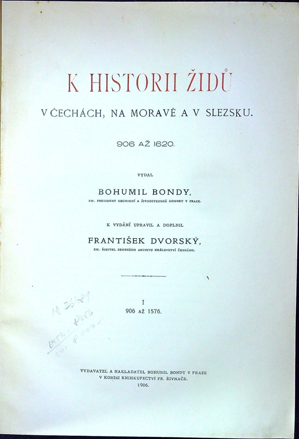 K historii Židů v Čechách, na Moravě a v Slezsku. 906 až 1620. Vydal ... K vydání upravil a doplnil František Dvorský, em. řiditel zemského archivu Královstvím českého.