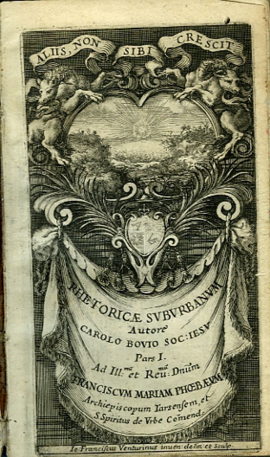 Praz 285<br>Rytý předtitul od Francisca Venturiniho, front. s alegorií rétoriky od I. Nolinuse podle kresby L. Gigmina, v textu 35 celostr. mědirytin. Viněty, tučně tištěné versálky ve výši dvou řádků. <br>Dobová vazba z hnědé hověziny, na obou deskách jednoduchý tlačený rám, ve hřbetu dva vazy. Vazba ohmataná, místy odřená, při spodním okraji chybí kus koženého pokryvu, na tit. list staré, nečitelné razítko. Strana XIX natržená.<br>giovanni Carlo Bovio (5.1. 1522 Brindisi - září 1570 Ostuni), vystudoval teologii a klasické a orientální jazyky na universitě v Boloni. Později jmenován arcibiskupem z Brindisi a Orie. V Orii postavil nový biskupský palác.