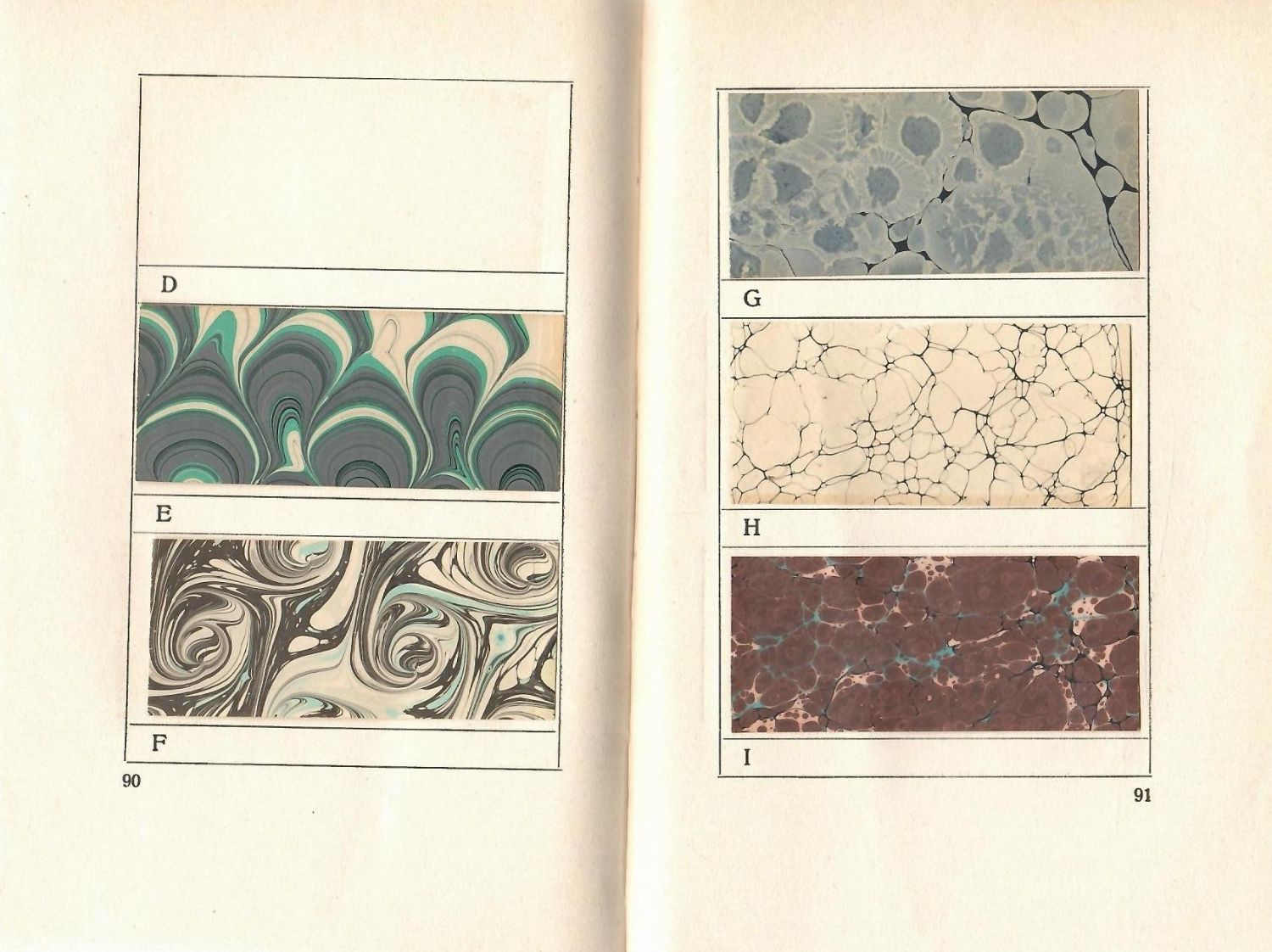 Mramorování. Papíry škrobové, natírané a jiné způsoby zpestřování papíru, s ilustracemi a ukázkami.