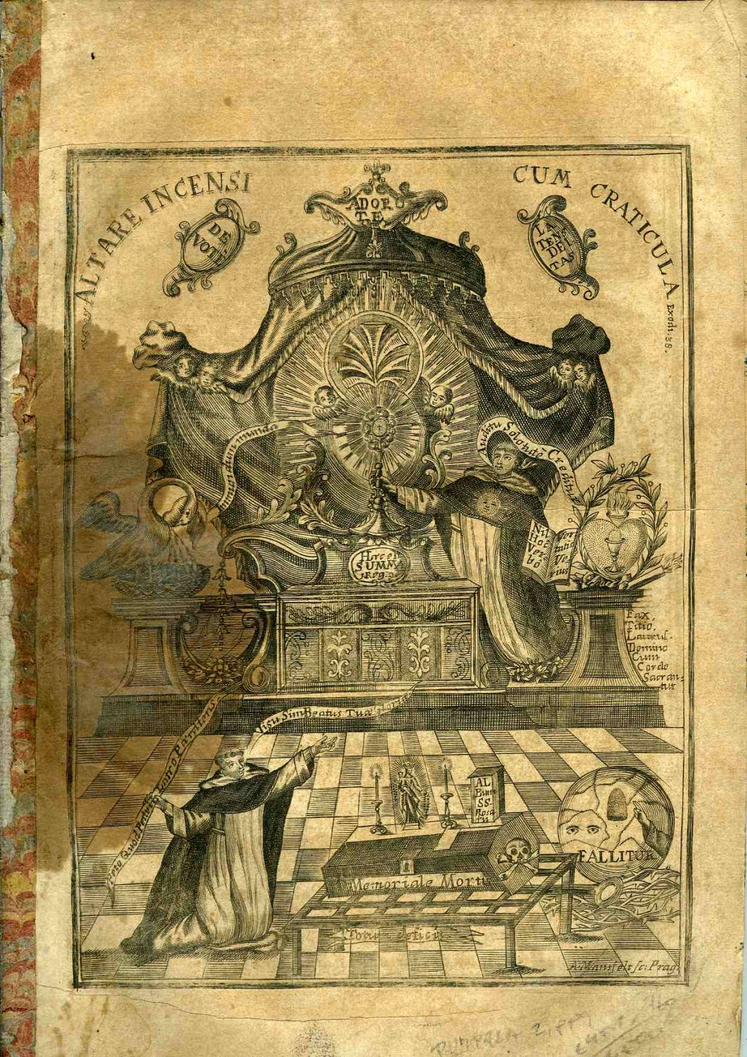 Pumprla 2, 889<br>Titulní strana rozdělena svislou čarou, v levé polovině titul latinsky, v pravé německy. Na rubu tit. listu tištěná dedikace královéhradeckému biskupovi Vratislavu z Mitrowicz (biskupem v letech 1733-1753). - Listy ve hřbetě slepeny páskou dobového tragantového papíru. Na předních listech po fol. B2 velká, postupně se zmenšující hnědá skvrna, drobnější hnědé skvrny i dále. - Vavřinec Karel (Laurentius Carolus) Brückner, pražský dominikánský kazatel.