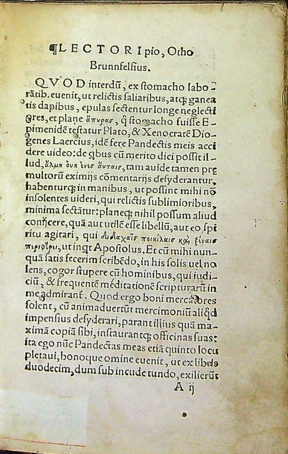 VD 16, B8536<br>Titulní list v dřevořezové, hnědě kolorované borduře, na foliu XXb dřevořezová bordura, tučně tištěné versálky zalomené do výše 4 řádků, na foliu 233a konturová iniciála v jednoduchém rámečku na rostlinném pozadí zalomená do výše 7 řádků, tištěné rubriky, živá záhlaví, impresum na foliu 269a.<br>Dobová renesanční vazba. Dřevěné destičky potažené černou hovězinou, na přední desce tlačený rám zdobený slepotiskem rostlinného ornamentu a s vyobrazením dle tlačeného jména Venuše a nezřetelné mužské postavy, v levé straně rámu vytlačený letopočet 1533 (sic!, kniha byla vytištěna 1535) a vytlačenými iniciálami HB (vratislavského mistra knihvazačského), nad horním okrajem vnitřního rámu tlačený název, ve spodním okraji tlačené iniciály objednatele vazby VKB, uvnitř rámu zrcadlo zdobené rostlinným ornamentem a uvnitř zrcadla pásový kolek, na desce zadní vnější rám zdobený rostlinným ornamentem, vnitřní jednoduchý rám uvnitř rozdělený na dvě pole zdobená rostlinným ornamentem, uprostřed dvě proti sobě stojící zbrojnoši s tasenými meči.. Na přední desce dva kovové úchyty, na zadní uchycená kožená přezka s kovovou sponou (druhá chybí). Ve hřbetu 3 vazy, barvené ořízky. Kožený pokryv místy proděravělý a kůže místy odřená. Na zadním přídeští provenienční přípis černým perem "Govi Gus Bartolomei G Bad 1645" (?). <br>Otto Brunfels (cca 1488 - 23.11. 1534 Bern) německý protestantský teolog a botanik. Carl von Linné ho označil za "otce botaniky", protože ve svých botanických spisech nevycházel ze starověkých autorů, ale opíral se o svá vlastní pozorování. Roku 1524 vydal též knihu o Janu Husovi s nepublikovanými texty Jana Husa. Od roku 1532 až do své smrti byl městským lékařem v Bernu. Publikoval též knihy o pedagogice, arabštině, farmacii, entomologii a botanice. Roku 1550 byl zařazen na první místo seznamu nejvýznamnějších kacířů, který vydala na příkaz císaře universita v Lovani.<br>Knihvazačský mistr H.B. působil ve Vratislavi a vázal knihy např. pro vratislavského humanistu a reformátora Jana Hesse (1490 - 1547), který byl v letech 1513-15 notářem biskupa Thurzy ve Vratislavi, od roku 1514 byl vychovatelem pravnuka Jiřího z Poděbrad, Jáchyma. Od roku 1523 byl farářem kostela Marie Magdaleny ve Vratislavi.