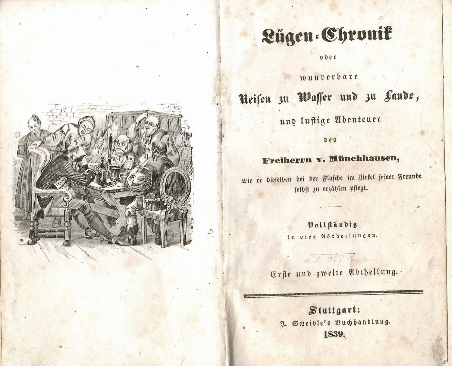 Rümann 275; Hayn-Got. V,237<br>Tištěno švabachem. - Dobová vazba s kartonovými deskami potaženými mramorovaným papírem, plátěný hřbet, ve hřbetu tlačený a zlacený název a rostlinné ornamenty, barvené ořízky. Vazba ohmataná a místy lehce odřená, naražené rohy. Na přední předsádce soukromý vlastnický přípis. <br>Kniha vyšla jako doplňující svazek k dílu G. A. Bürgera "Baron Prášil", kterou autor přeložil z angličtiny a rozšířil o celou řadu dalších neuvěřitelných příběhů a fantaskních historek (kniha vyšla poprvé roku 1786). Předtitul nese název "Lieblingsbücher in alten und neueren Geschichten, Sagen und Schwänken. Zur Ergötzlich für Stände in eine Sammlung gebracht, auch bin und wieder mit dienlichen Bildern geziert durch Willibald Cornelius. Dritter und viertel Theil Münchhausen´s Lügenchronik". Na ilustracích, na tehdejší dobu, řada erotických a obscénních vyobrazení, které vtipně doplňují příběhy barona Prášila. Dle Wellerova slovníku německých pseudonymů je ve skutečnosti autorem ilustrací sám nakladatel Johann Scheible (1809 - 1866 Stuttgart).