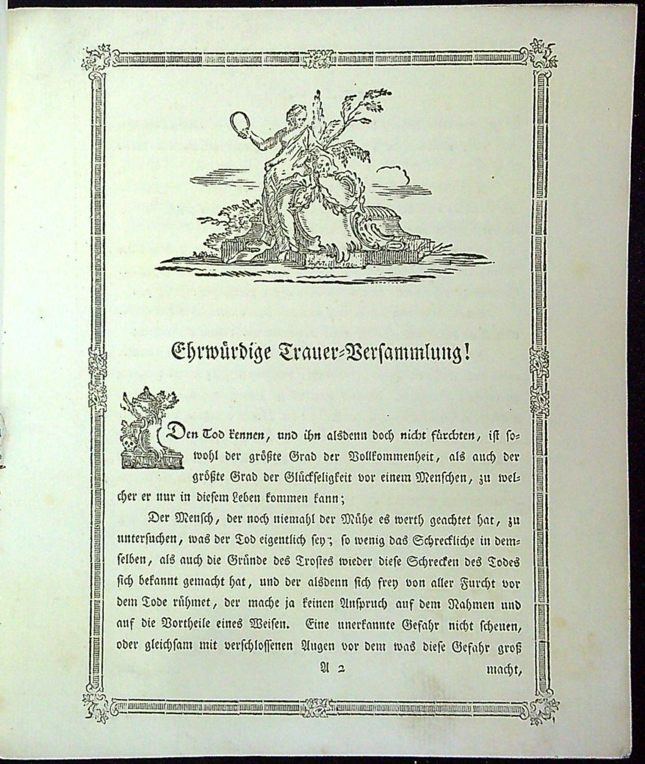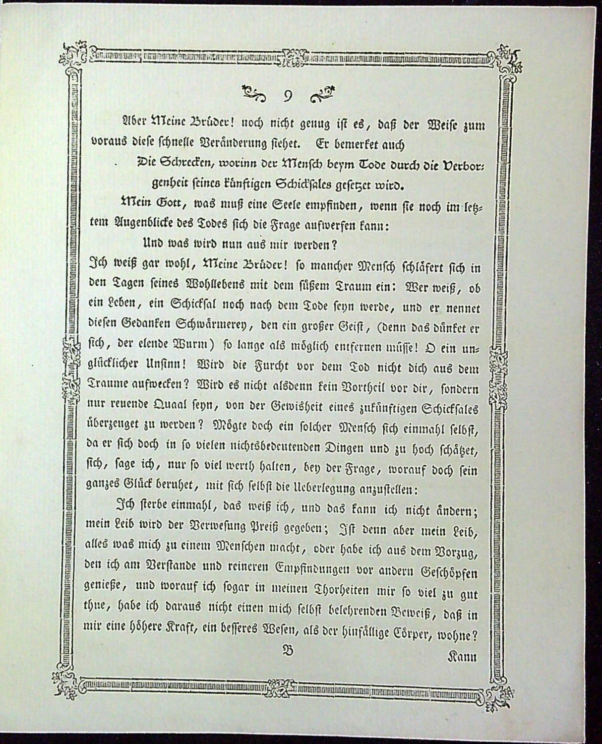 Wolfstieg neeviduje; KVK neeviduje; Worldcat katalog eviduje 1 ex. v Universitní knihovně v Poznani.<br>Tištěno švabachem, titulní list i jednotlivé strany olemovány ozdobným rámečkem, na tit. listu viněta, v záhlaví první strany textu vlys a plná iniciálka s ilustrací po straně, arabská paginace stran uprostřed horního okraje mezi prolamovanými lístky, koncová drobná vinětka. - Knižní blok šitý nití, na tit. listu staré razítko zednářské lóže "Minerva zu den drei Palmen" v Lipsku.