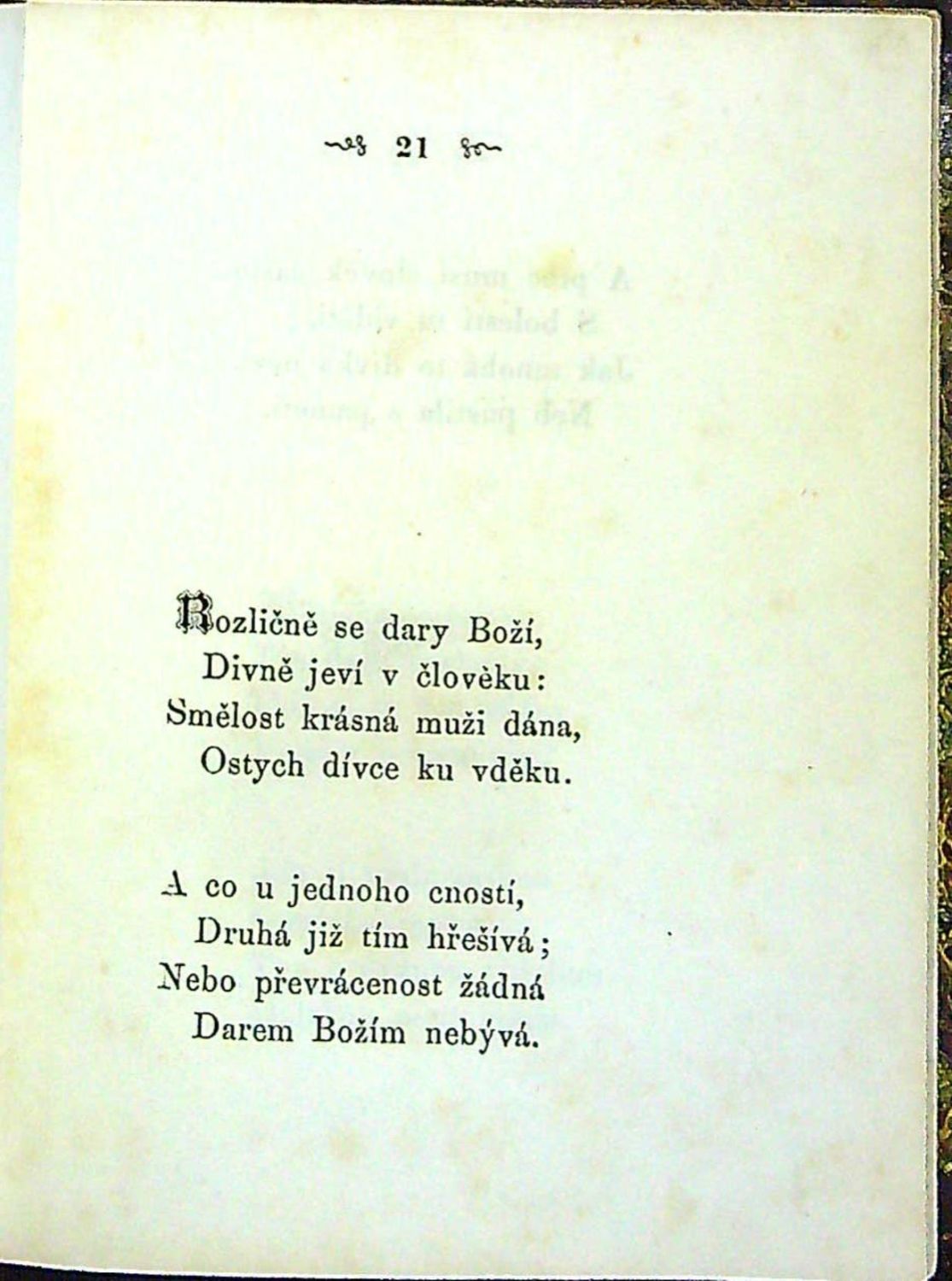 Tištěno antikvou, tučně tištěné iniciálky v úvodu jednotlivých básní, vinětky, uprostřed horního okraje stran arabská paginace stran mezi ozdůbkami z mizící linky. . Dobová vazba s kartonovými deskami potaženými mramorovaným papírem, kožená hřbet a nárožnice. Ve hřbetu tlačený a zlacený název mezi tlačeným a zlaceným ornamentem. Vazba lehce ohmataná, při horním i spodním okraji hřbetu kůže mírně odřená, naražené rohy. Strana VII (obsah) uprostřed téměř po celé výši natržená. V textu tu a tam drobné hnědé skvrnky způsobené kyselostí papíru.