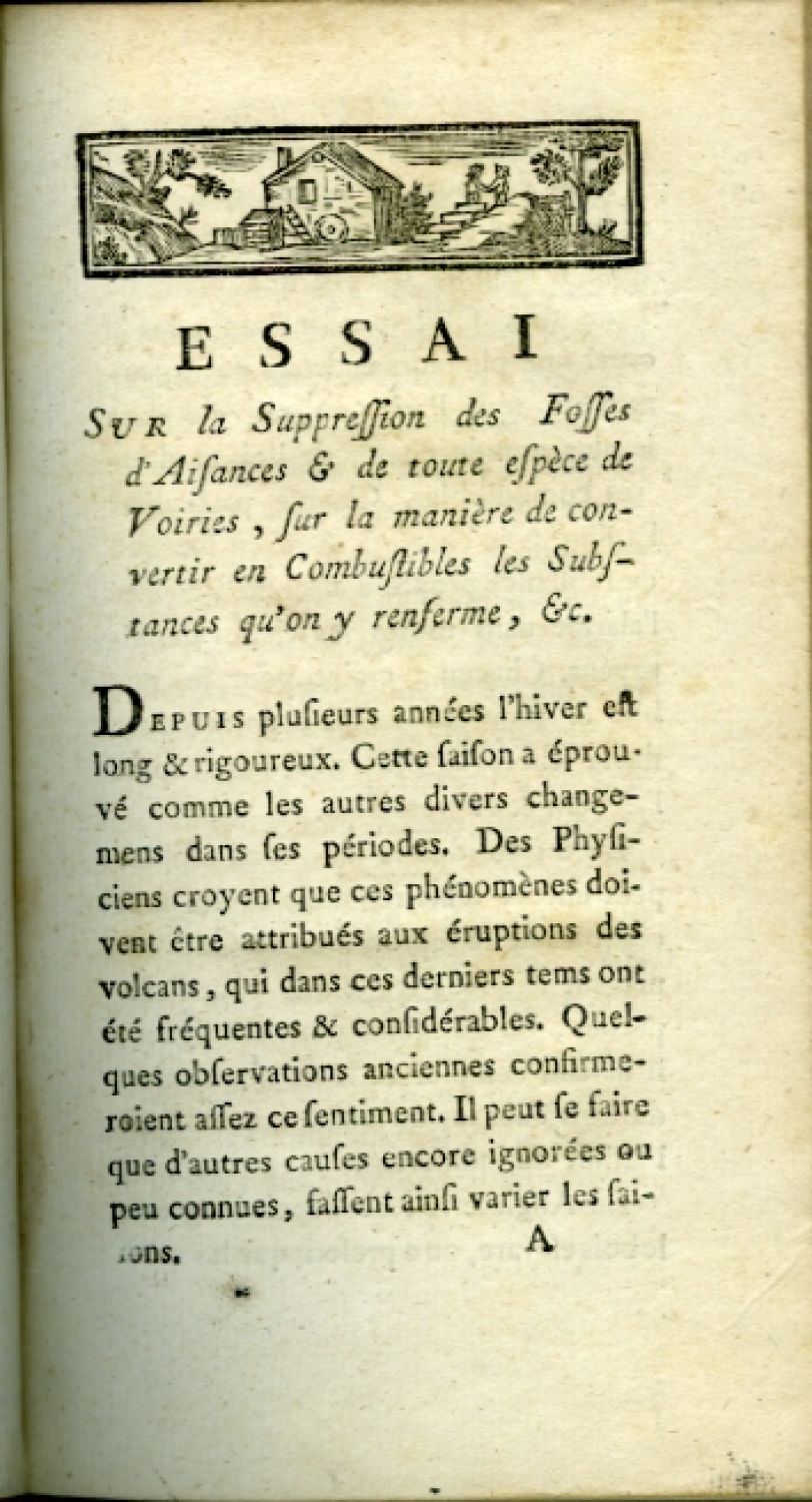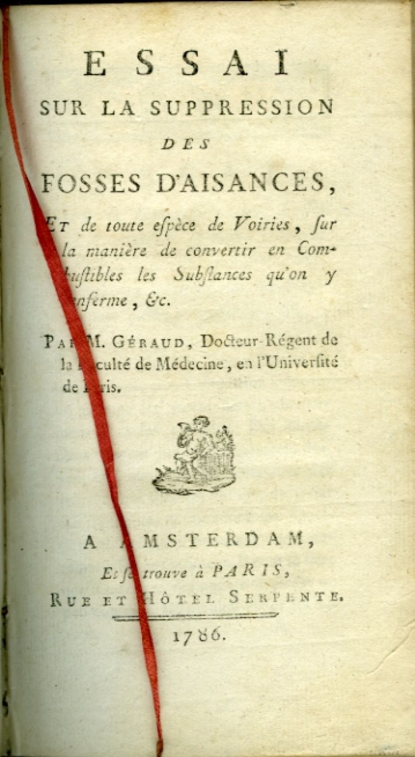 Géraud, (?): ESSAI SUR LA SUPPRESSION DES FOSSES D'AISANCES, ET de toute espèce de Voiries, sur la manière de convertir en Combustibles les Substances qu'on y renferme, Etc. PAR M. ... Docteur Régent de la Faculté de Médecine, en l'Université de Paris. A Amsterdam et se trouve à Paris, (b. t.), 1786, tit., 179, (1) s. Dřevořez. tit. vinětka a vlys na s. 1. - Poznámky o zlepšovacích návrzích na veřejná opatření proti přírodním kalamitám.<br>