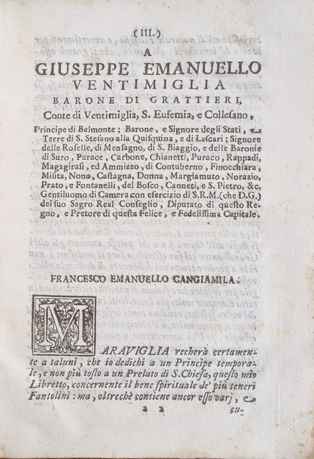 Graesse II,34; Wellcome II,295; Worldcat eviduje pouze 1 exmplář v Universitní knihovně v Lipsku.<br>Tištěno antikvou italsky, živá záhlaví, tištěné poznámky pod čarou, viněty, tučně tištěné versálky ve výši 3-4 řádků, konturové iniciály ve dvojitém jednoduchém rámečku na ilustrativním pozadí ve výši 5-10 řádků, tiskařské ozdůbky. Kniha se skládá ze čtyř průběžně paginovaných částí. Na konci obsah a rejstřík.<br>Dobová pergamenová vazba, při horním okraji hřbetu inkoustem napsaný název. Vazba ohmataná a místy zašpiněná, pergamenový pokryv místy lehce zkrabatělý. Na titulním listu razítko z 18. či 19. století a rkp. přípis "Magdalena di Urbe" (Řím), na rubu přední předsádky rkp. provenienční přípis z konce 18. století ".... Bibliotecq S. Maria Magdalena in Urbe" (stejný přípis na straně 80). Chybí příloha - mědirytinová rozkládací tabule s vyobrazením embrya v různých stádiích.<br>Francois-Emmanuel Cangiamila (1.1. 1702 Palermo - 7.1. 1763 Palermo), italský duchovní, kanovník metropole Palerma a provinční inkvizitor Království Sicílie. Nabízené dílo pojednává o soukromé zpovědi, osobní hygieně a zabývá se též právem spojeným s medicínou ve vztahu k těhotným ženám. Kniha též pojednává o důležitosti křtu potracených dětí, neboť duše je dle jeho argumentů naplněna již od početí, bez křtu by nenarozené děti byly odsouzeny k věčnému limbu. Kniha vzbudila velký ohlas a již v průběhu 18. století byla přeložena do několika jiných jazyků, mimo jiné do novořečtiny.