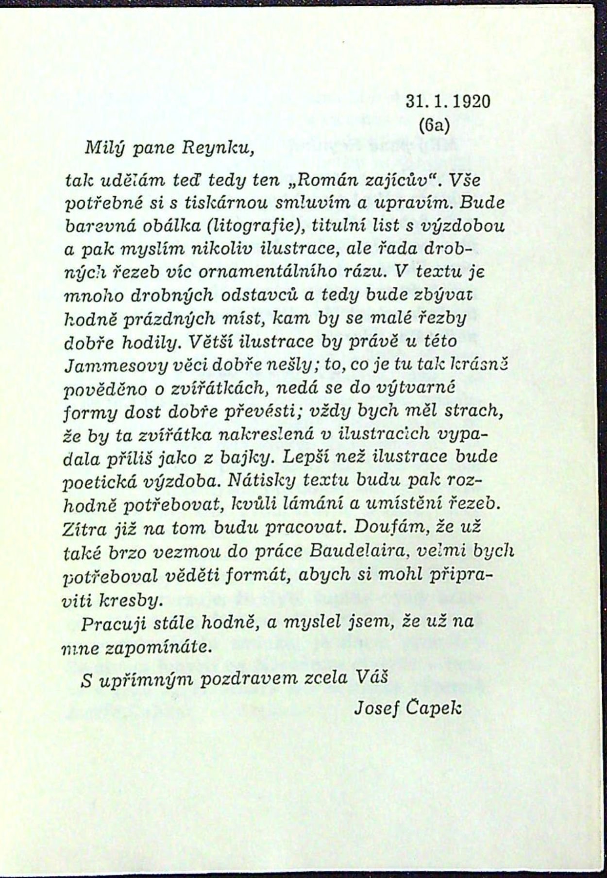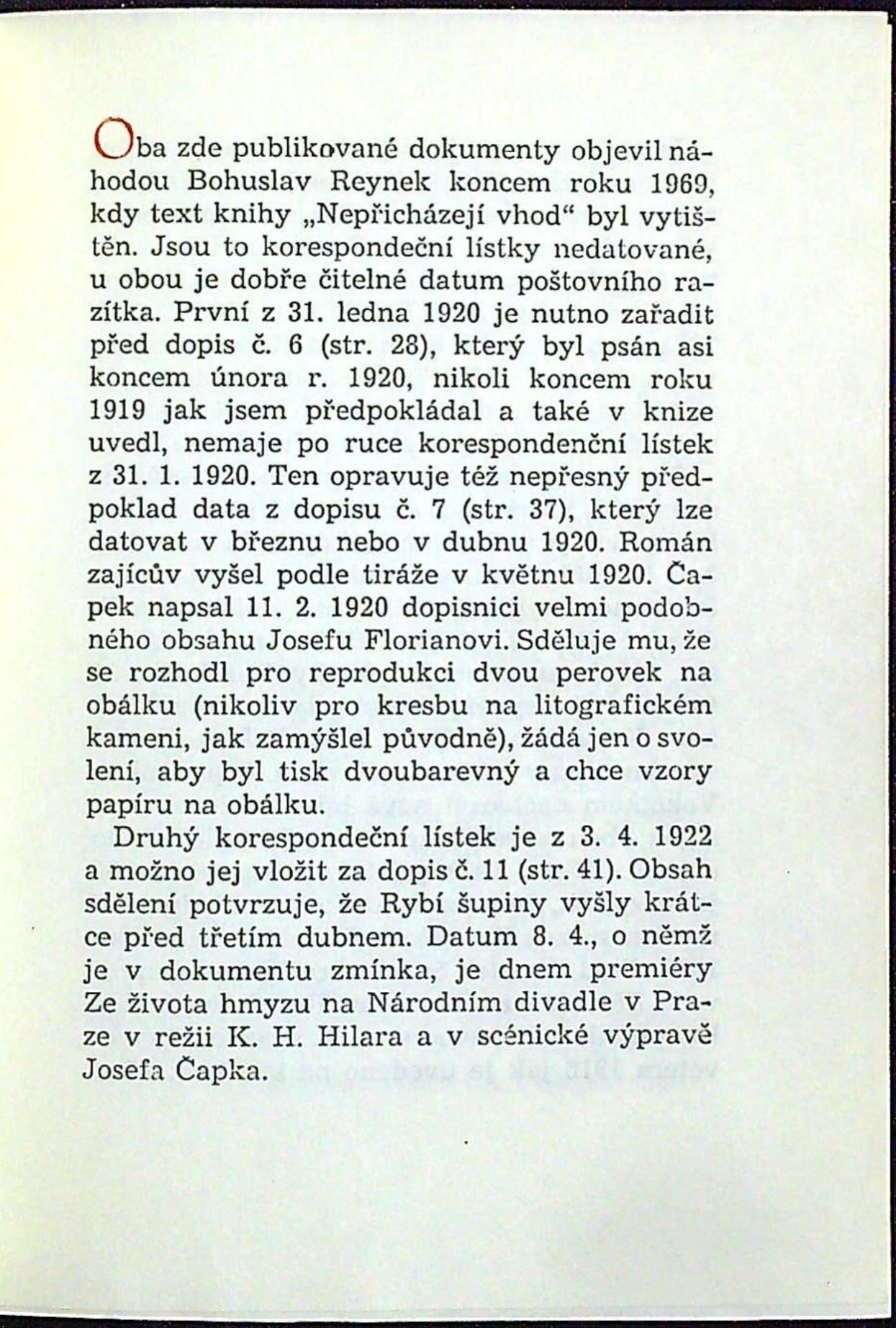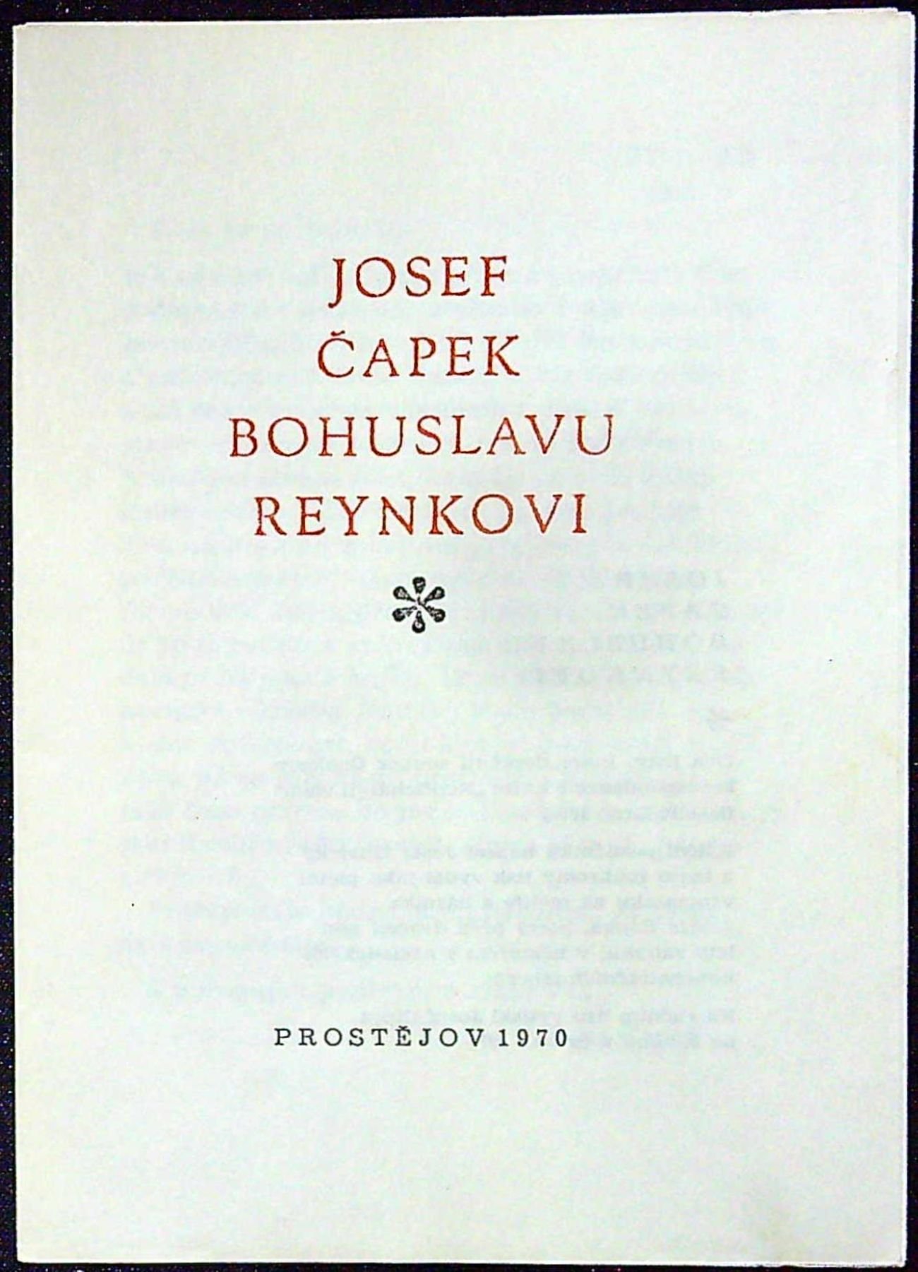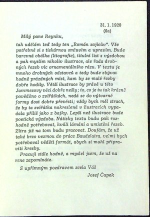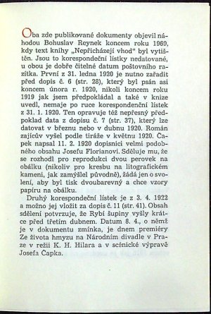 Jeden z neudaného počtu výtisků, které na ručním lisu vytiskl Josef Cipra v Kladně, červeno-černě tištěný tit. list. Ediční poznámku napsal Josef Glivický, dva otištěné listy Čapkovy doplňují soubor jeho korespondence vydané v knize "Nepřicházejí vhod" vydané nakl. BLOK v Brně roku 1969..